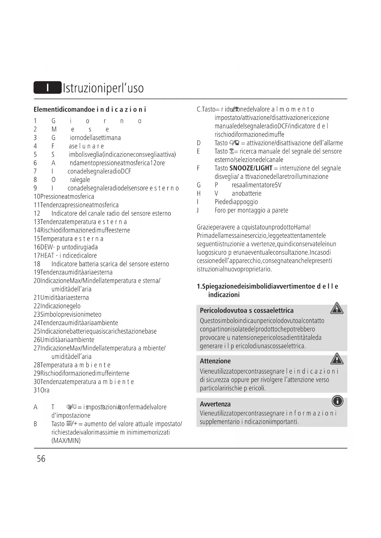 Conformiteitsverklaring Hierbij verklaar ik, Hama GmbH &CoKG, dat het type radioapparatuur [00186418] conform is met Richtlijn 2014/53/EU.Devolledige tekst van de EU-conformiteitsverklaring kan worden geraadpleegd op het volgende internetadres: www.hama.com->00186418->Downloads. Frequentieband(en) 433MHz Maximaal radiofrequent vermogen 0,222mW56 I Istruzioni per l‘uso Elementi di comando eindicazioni 1Giorno 2Mese 3Giorno della settimana 4Faselunare 5Simboli sveglia (indicazione con sveglia attiva) 6Andamento pressione atmosferica 12 ore 7Icona del segnale radio DCF 8Ora legale 9Icona del segnale radio del sensoreesterno 10 Pressione atmosferica 11 Tendenza pressione atmosferica 12 Indicatoredel canale radio del sensoreesterno 13 Tendenza temperaturaesterna 14 Rischio di formazione di muffe esterne 15 Temperaturaesterna 16 DEW -punto di rugiada 17 HEAT-indice di calore 18 Indicatorebatteria scarica del sensoreesterno 19 Tendenza umidità aria esterna 20 Indicazione Max/Min della temperaturaesterna/ umidità dell’aria 21 Umidità aria esterna 22 Indicazione gelo 23 Simbolo previsioni meteo 24 Tendenza umidità aria ambiente 25 Indicazione batterie quasi scariche stazione base 26 Umidità aria ambiente 27 Indicazione Max/Min della temperaturaambiente/ umidità dell’aria 28 Temperaturaambiente 29 Rischio di formazione di muffe interne 30 Tendenza temperaturaambiente 31 Ora ATasto =impostazioni/conferma del valore d'impostazione BTasto =aumento del valoreattuale impostato/ richiesta dei valori massimi eminimi memorizzati (MAX/MIN) C. Tasto =riduzione del valorealmomento impostato/attivazione/disattivazione ricezione manuale del segnale radio DCF/indicatoredel rischio di formazione di muffe DTasto =attivazione/disattivazione dell’allarme ETasto =ricerca manuale del segnale del sensore esterno/selezione del canale FTasto SNOOZE/LIGHT =interruzione del segnale di sveglia /attivazione della retroilluminazione GPresa alimentatore5V HVano batterie IPiede di appoggio JForoper montaggio aparete Grazie per avereacquistato un prodotto Hama! Prima della messa in esercizio, leggete attentamente le seguenti istruzioni eavvertenze, quindi conservatele in un luogo sicuroper una eventuale consultazione. In caso di cessione dell‘apparecchio, consegnate anche le presenti istruzioni al nuovo proprietario.
