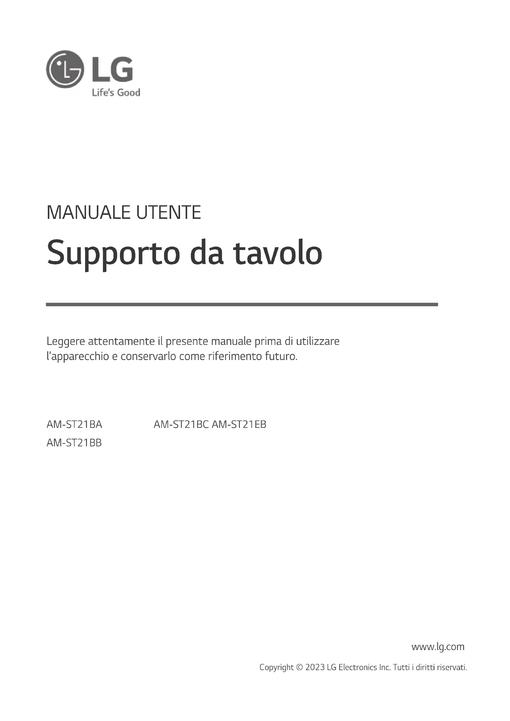 - Fare attenzione alle dita quando si regola l’angolazione della TV. - Se le mani o le dita restano incastrate, ci si può ferire. Sesi inclina eccessivamente il prodotto, potrebbe cadere causando lesioni o danni. Specifiche tecniche AM-ST21BA Modello 43UR762H 43UN342H 43UN662M 43UM662H Larghezza x Profondità x Altezza (mm) 570 x 303 x 244 Peso (kg) 3,2 AM-ST21BB Modello 50UR762H 50UR765H 50UN342H 50UN662M 50UM662H Larghezza x Profondità x Altezza (mm) 570 x 303 x 244 Peso (kg) 3,2 AM-ST21BC Modello 55UR762H 55UR765H 55UN342H 55UN662M 55UM662H Larghezza x Profondità x Altezza (mm) 570 x 303 x 244 Peso (kg) 3,2 AM-ST21EB Modello 50/55UR767H 50/55UR777H Larghezza x Profondità x Altezza (mm) 570 x 303 x 232 Peso (kg) 3,27 ITALIANOIl modello e il numero di serie del prodotto si trovano sul retro e su un lato del prodotto. Annotarli qui di seguito nel caso in cui fosse necessario contattare l’assistenza. Modello N. di serieMANUAL DE USUARIO Soporte www.lg.com Copyright © 2023 LG Electronics Inc. Reservados todos los derechos. Antes de utilizar el equipo, lea este manual con atención y consérvelo para consultarlo cuando lo necesite. AM-ST21BA AM-ST21BB AM-ST21BC AM-ST21EB2 ESPAÑOL (EUROPE)