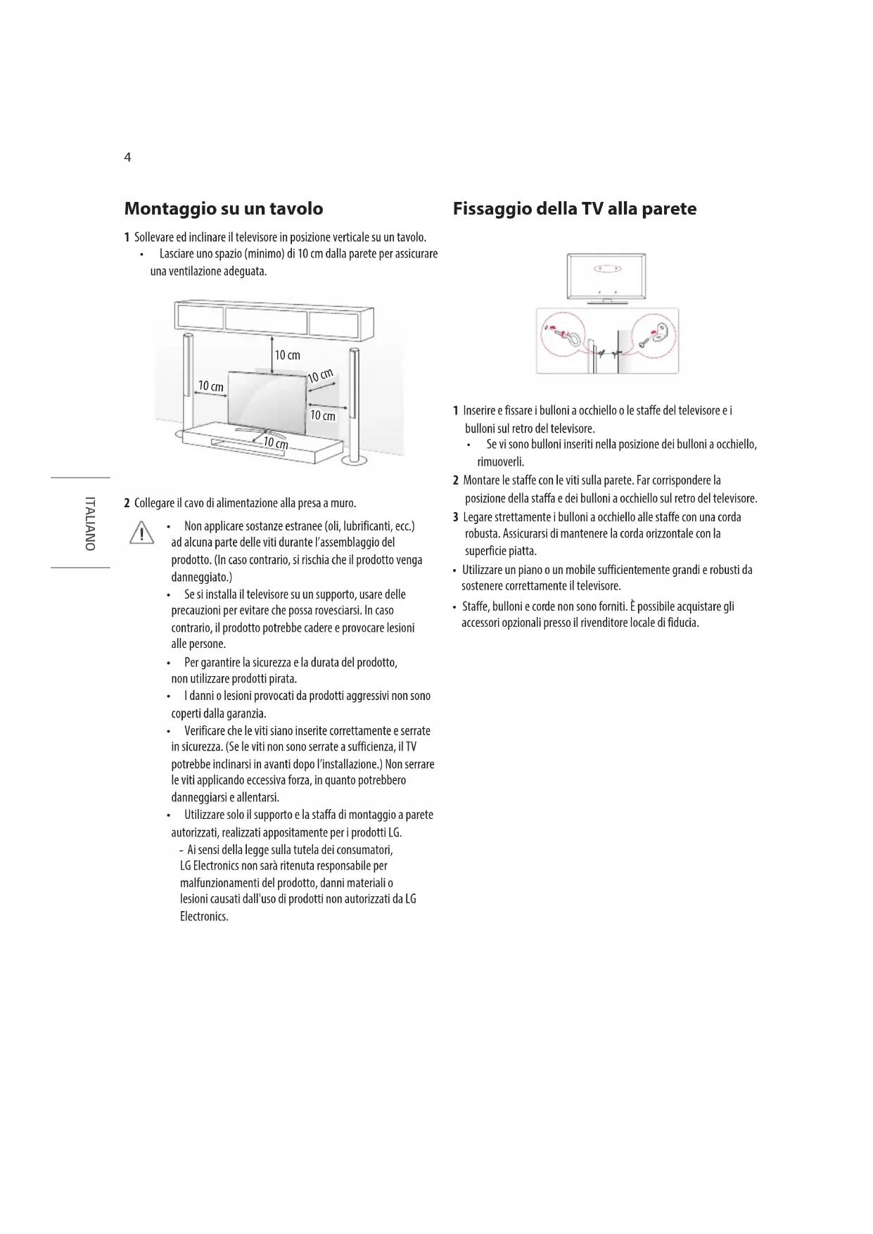 - Utilizzare solo il supporto e la staffa di montaggio a parete autorizzati, realizzati appositamente per i prodotti LG. - Ai sensi della legge sulla tutela dei consumatori, LG Electronics non sarà ritenuta responsabile per malfunzionamenti del prodotto, danni materiali o lesioni causati dall'uso di prodotti non autorizzati da LG Electronics. Fissaggio della TV alla parete 1 Inserire e fissare i bulloni a occhiello o le staffe del televisore e i bulloni sul retro del televisore.