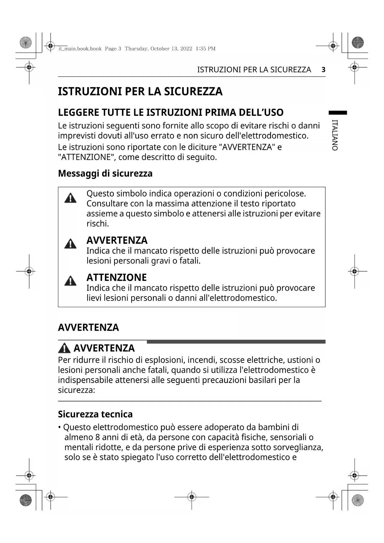 - Questo elettrodomestico può essere adoperato da bambini di almeno 8 anni di età, da persone con capacità fisiche, sensoriali o mentali ridotte, e da persone prive di esperienza sotto sorveglianza, solo se è stato spiegato l'uso corretto dell'elettrodomestico e Questo simbolo indica operazioni o condizioni pericolose. Consultare con la massima attenzione il testo riportato assieme a questo simbolo e attenersi alle istruzioni per evitare rischi. AVVERTENZA Indica che il mancato rispetto delle istruzioni può provocare lesioni personali gravi o fatali. ATTENZIONE Indica che il mancato rispetto delle istruzioni può provocare lievi lesioni personali o danni all'elettrodomestico. it_main.book.book Page 3 Thursday, October 13, 2022 1:35 PM4