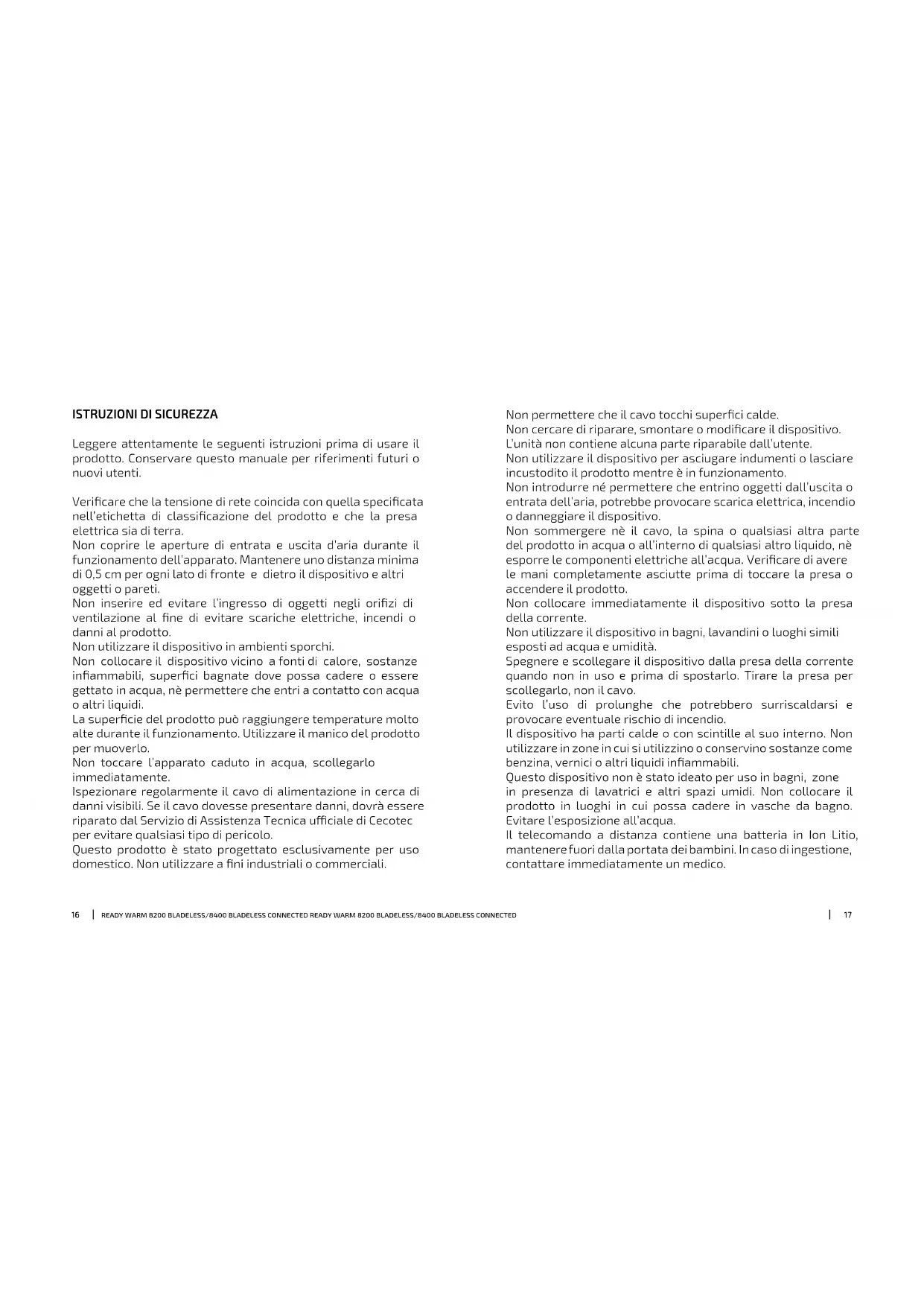 Leggere attentamente le seguenti istruzioni prima di usare il prodotto. Conservare questo manuale per riferimenti futuri o nuovi utenti. Vericare che la tensione di rete coincida con quella specicata nell’etichetta di classicazione del prodotto e che la presa elettrica sia di terra. Non coprire le aperture di entrata e uscita d’aria durante il funzionamento dell’apparato. Mantenere uno distanza minima di 0,5 cm per ogni lato di fronte e dietro il dispositivo e altri oggetti o pareti. Non inserire ed evitare l’ingresso di oggetti negli orizi di ventilazione al ne di evitare scariche elettriche, incendi o danni al prodotto. Non utilizzare il dispositivo in ambienti sporchi. Non collocare il dispositivo vicino a fonti di calore, sostanze inammabili, superci bagnate dove possa cadere o essere gettato in acqua, nè permettere che entri a contatto con acqua o altri liquidi. La supercie del prodotto può raggiungere temperature molto alte durante il funzionamento. Utilizzare il manico del prodotto per muoverlo. Non toccare l’apparato caduto in acqua, scollegarlo immediatamente. Ispezionare regolarmente il cavo di alimentazione in cerca di danni visibili. Se il cavo dovesse presentare danni, dovrà essere riparato dal Servizio di Assistenza Tecnica uciale di Cecotec per evitare qualsiasi tipo di pericolo. Questo prodotto è stato progettato esclusivamente per uso domestico. Non utilizzare a ni industriali o commerciali. Non permettere che il cavo tocchi superci calde. Non cercare di riparare, smontare o modicare il dispositivo. L’unità non contiene alcuna parte riparabile dall’utente. Non utilizzare il dispositivo per asciugare indumenti o lasciare incustodito il prodotto mentre è in funzionamento. Non introdurre né permettere che entrino oggetti dall’uscita o entrata dell’aria, potrebbe provocare scarica elettrica, incendio o danneggiare il dispositivo. Non sommergere nè il cavo, la spina o qualsiasi altra parte del prodotto in acqua o all’interno di qualsiasi altro liquido, nè esporre le componenti elettriche all’acqua. Vericare di avere le mani completamente asciutte prima di toccare la presa o accendere il prodotto. Non collocare immediatamente il dispositivo sotto la presa della corrente. Non utilizzare il dispositivo in bagni, lavandini o luoghi simili esposti ad acqua e umidità. Spegnere e scollegare il dispositivo dalla presa della corrente quando non in uso e prima di spostarlo. Tirare la presa per scollegarlo, non il cavo. Evito l’uso di prolunghe che potrebbero surriscaldarsi e provocare eventuale rischio di incendio. Il dispositivo ha parti calde o con scintille al suo interno. Non utilizzare in zone in cui si utilizzino o conservino sostanze come benzina, vernici o altri liquidi inammabili. Questo dispositivo non è stato ideato per uso in bagni, zone in presenza di lavatrici e altri spazi umidi. Non collocare il prodotto in luoghi in cui possa cadere in vasche da bagno. Evitare l’esposizione all’acqua. Il telecomando a distanza contiene una batteria in Ion Litio, mantenere fuori dalla portata dei bambini. In caso di ingestione, contattare immediatamente un medico.1918 READY WARM 8200 BLADELESS/8400 BLADELESS CONNECTED READY WARM 8200 BLADELESS/8400 BLADELESS CONNECTED Per evitare possibili fughe della batteria rimuovere la batteria del telecomando a distanza se non vada durante un periodo di tempo. L’apparato non deve essere usato da bambini da 0 a 8 anni. Questo elettrodomestico può essere usato da bambini a partire dagli 8 anni sotto la sorveglianza continua di un adulto. Questo prodotto può essere usato da bambini a partire dagli 8 anni e persone con capacità siche, sensoriali o mentali limitate, o con mancanza di esperienza e conoscenza solo sotto sorveglianza o avendo ricevuto istruzioni riguardanti l’uso dell’apparato in una forma sicura e comprendono i rischi che lo stesso implica. Supervisionare i bambini per assicurarsi che non giochino con il prodotto. È necessario sorvegliare rigidamente nel caso in cui il prodotto venga utilizzato da o vicino a bambini. Istruzioni delle pile. Mantenere le pile fuori dalla portata dei bambini e degli animali, potrebbero rivelarsi dannose se ingerite. In caso di ingerire, recarsi immediatamente al medico. In caso di fuoriuscita di liquido dalle pile, evitare il contatto con la pelle, gli occhi e le mucose. In caso di contatto con l’acido, lavare immediatamente e con acqua abbondante le zone interessate e contattare un medico il prima possibile. Vericare che i contatti delle pile dentro il dispositivo siano puliti prima di inserirli. Pulire qualora necessario. Utilizzare unicamente il tipo di pile indicato nelle speciche tecniche. Cambiare sempre tutte le pile allo stesso tempo. Non utilizzare pile di dierente tipo o capacità. Controllare la polarità quando si sostituiscono le pile (+/-). Ritirare le pile dal dispositivo quando sono scariche o quando il prodotto non viene usato per un tempo. Le pile non devono essere ricaricate, aperte, gettate nel fuoco né cortocircuitare.