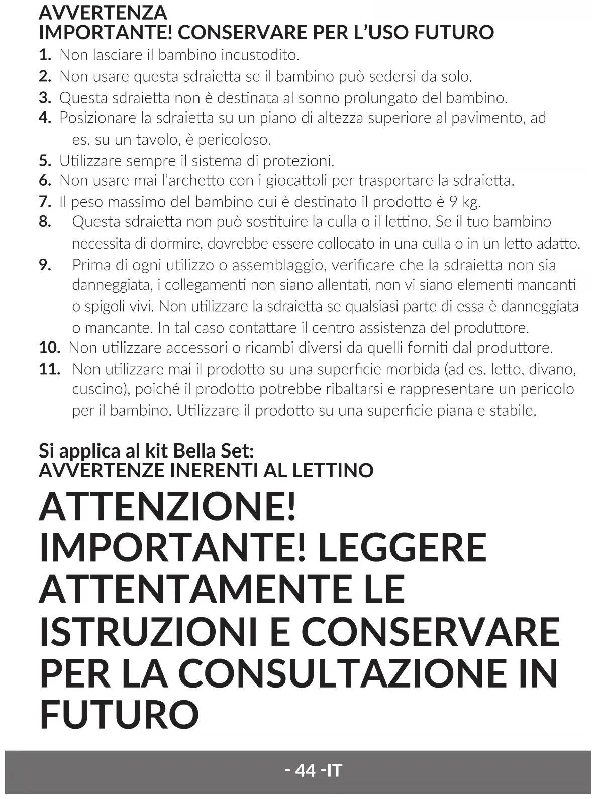 Non ulizzare mai il prodoo su una supercie morbida (ad es. leo, divano, cuscino), poiché il prodoo potrebbe ribaltarsi e rappresentare un pericolo per il bambino. Ulizzare il prodoo su una supercie piana e stabile. Si applica al kit Bella Set: