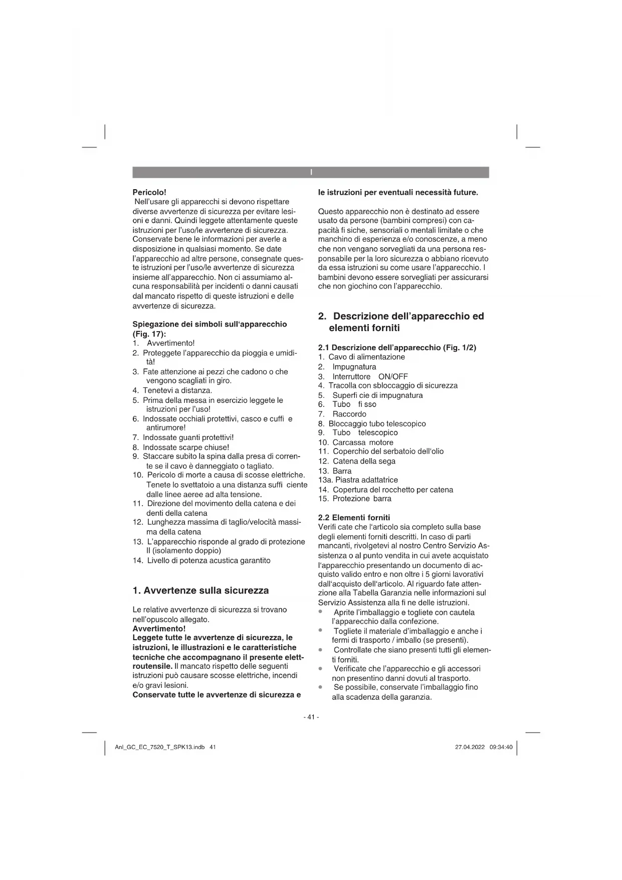 Accendete lo svettatoio elettrico con l‘interruttore ON/OFF (Fig. 13/Pos. 3). Ora potete mollare il blocco dell‘avviamento. Spegnimento Mollate l‘interruttore ON/OFF (Fig. 13/Pos. 3). Staccate sempre la spina dalla presa di corrente se interrompete il lavoro. Anl_GC_EC_7520_T_SPK13.indb 44Anl_GC_EC_7520_T_SPK13.indb 44 27.04.2022 09:34:4127.04.2022 09:34:41I