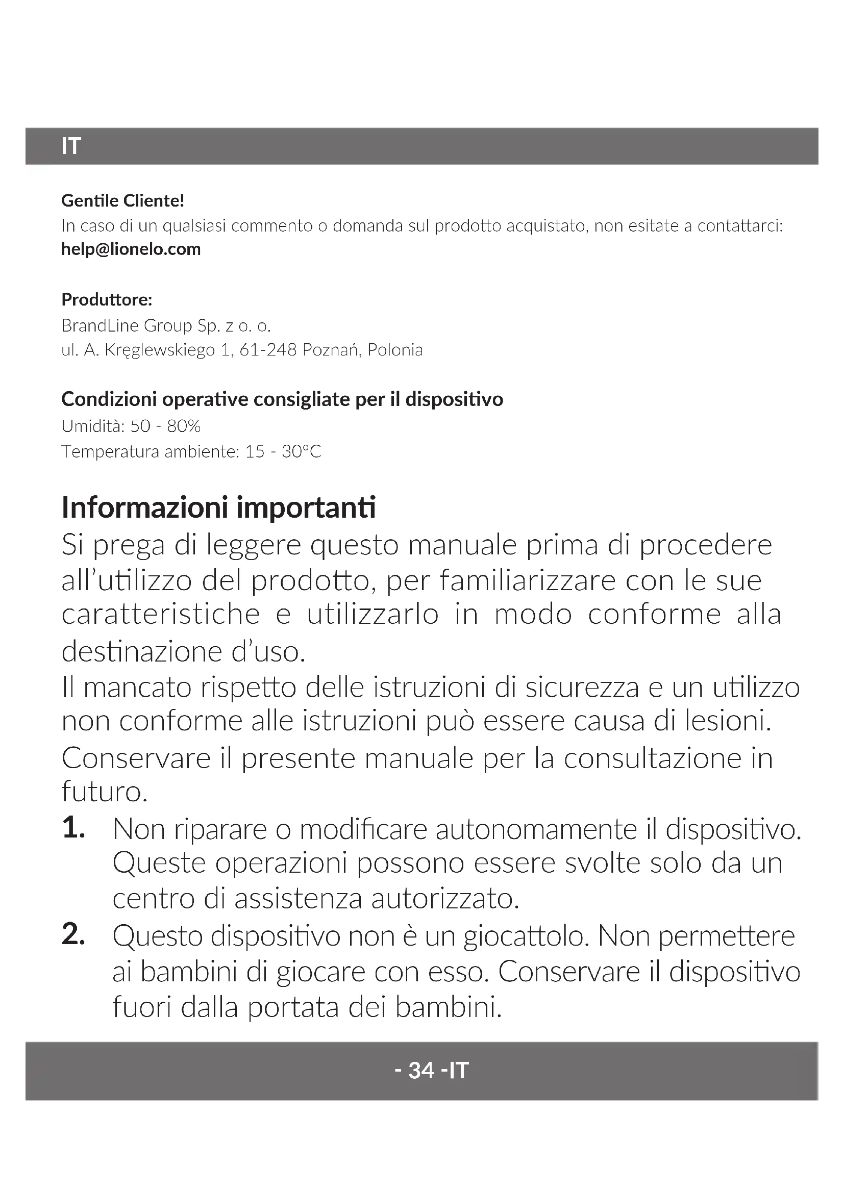 Genle Cliente! In caso di un qualsiasi commento o domanda sul prodoo acquistato, non esitate a contaarci: help@lionelo.com Produore: BrandLine Group Sp. z o. o. ul. A. Kręglewskiego 1, 61-248 Poznań, Polonia Condizioni operave consigliate per il disposivo Umidità: 50 - 80% Temperatura ambiente: 15 - 30°C Informazioni importan Si prega di leggere questo manuale prima di procedere all’ulizzo del prodoo, per familiarizzare con le sue caratteristiche e utilizzarlo in modo conforme alla desnazione d’uso. Il mancato rispeo delle istruzioni di sicurezza e un ulizzo non conforme alle istruzioni può essere causa di lesioni. Conservare il presente manuale per la consultazione in futuro.