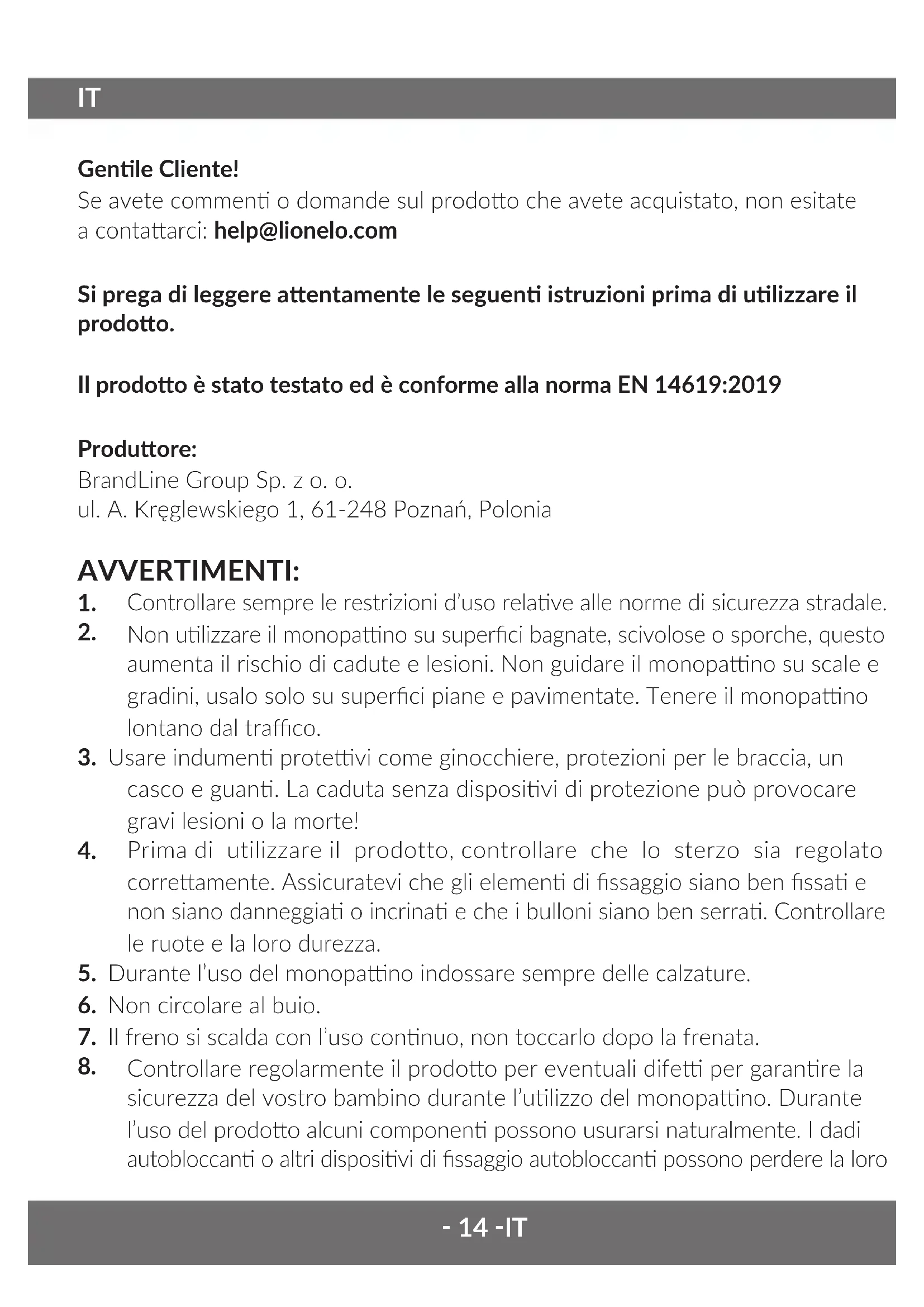 Genle Cliente! Se avete commen o domande sul prodoo che avete acquistato, non esitate a contaarci: help@lionelo.com Si prega di leggere aentamente le seguen istruzioni prima di ulizzare il prodoo. Il prodoo è stato testato ed è conforme alla norma EN 14619:2019 Produore: BrandLine Group Sp. z o. o. ul. A. Kręglewskiego 1, 61-248 Poznań, Polonia AVVERTIMENTI: