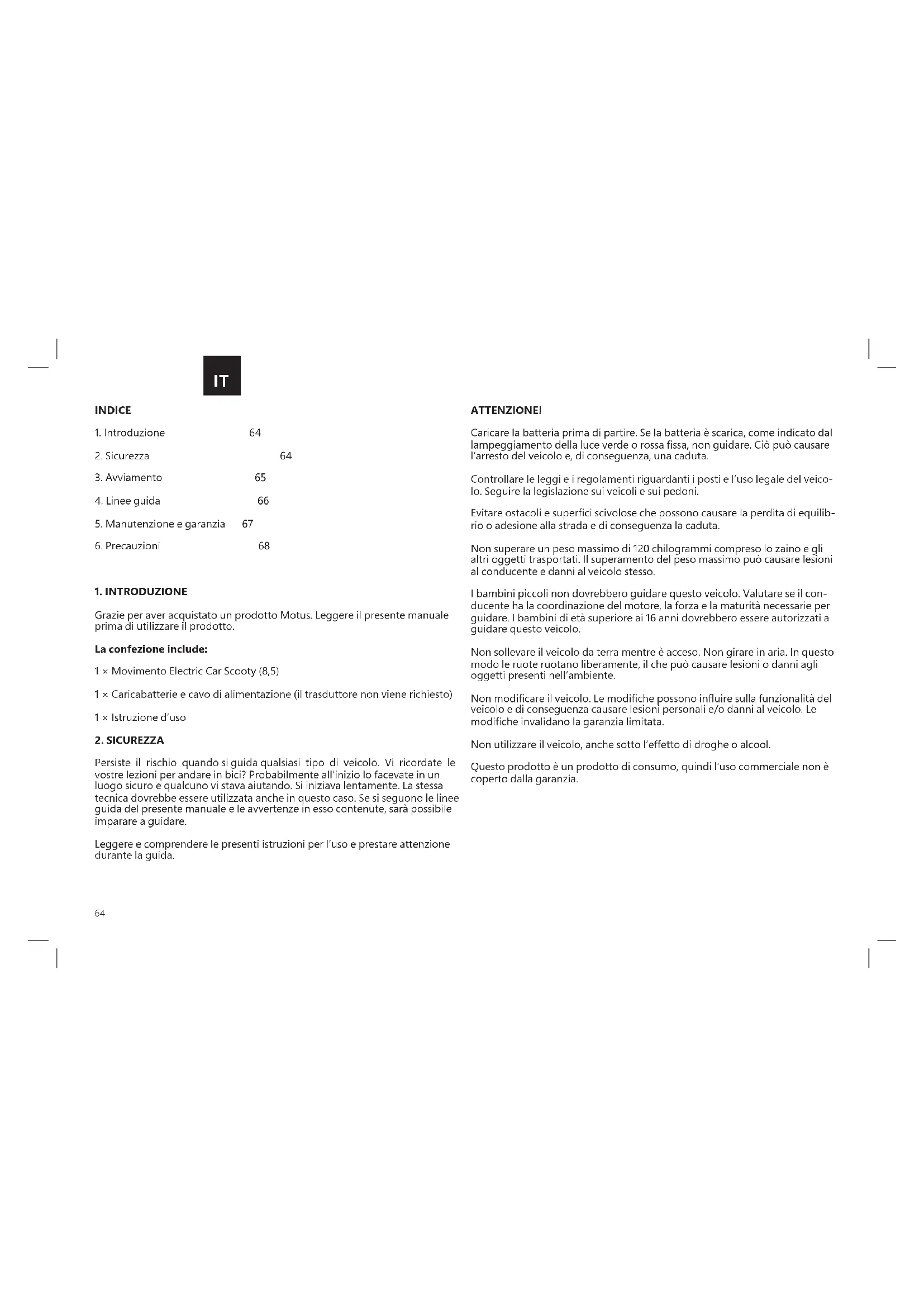 Grazie per aver acquistato un prodotto Motus. Leggere il presente manuale prima di utilizzare il prodotto. La confezione include: 1 × Movimento Electric Car Scooty (8,5) 1 × Caricabatterie e cavo di alimentazione (il trasduttore non viene richiesto) 1 × Istruzione d’uso