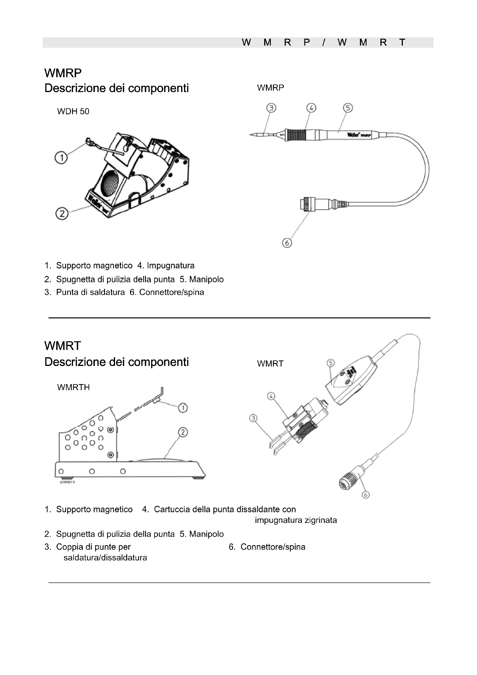Utilizzare il saldatore a stilo WMRP o la micropinzetta dissaldante WMRT esclusivamente allo scopo indicato nelle istruzioni per l'uso per il rilascio, l'alloggiamento e il fissaggio di componenti dei chip secondo le condizioni ivi specificate. L'uso previsto del saldatore a stilo WMRP o della micropinzetta dissaldante WMRT comprende inoltre che − le presenti istruzioni vengano lette e rispettate, − tutti i documenti di accompagnamento aggiuntivi vengano letti e rispettati, − i regolamenti nazionali sulla prevenzione degli incidenti applicabili in base alla sede in cui viene utilizzato il dispositivo vengano rispettati. Il produttore non si assume alcuna responsabilità per i danni risultanti da una mancata osservanza delle presenti istruzioni per l'uso durante l'utilizzo del dispositivo o da modifiche non autorizzate allo stesso.6-12 WMRP/WMRT 3 Ambito della fornitura WMRP: − Saldatore a stilo WMRP, T005 29 171 99 − Supporto di sicurezza WDH 50 con arresto + funzione di avvio per WMRP, T005 15 156 99 − Punta di saldatura RT 3 da 40 W, T005 44 603 99 − Istruzioni per l'uso − Opuscolo sulla sicurezza WMRT: − Micropinzetta dissaldante WMRT, T005 13 174 99 − Supporto di sicurezza WMRTH con arresto + funzione di avvio per WMRT, T005 15 146 99 − Serie di punte RTW 2 da 0,7 x 0,4 mm, 45°, T005 44 652 99 − Istruzioni per l'uso − Opuscolo sulla sicurezza 4 Descrizione del dispositivo