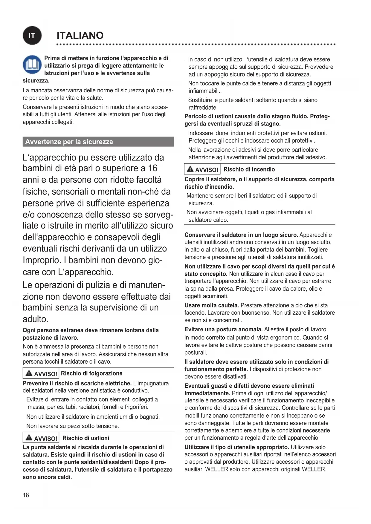 - Non avvicinare oggetti, liquidi o gas inammabili al saldatore caldo. Conservare il saldatore in un luogo sicuro. Apparecchi e utensili inutilizzati andranno conservati in un luogo asciutto, in alto o al chiuso, fuori dalla portata dei bambini. Togliere tensione e pressione agli utensili di saldatura inutilizzati. Non utilizzare il cavo per scopi diversi da quelli per cui è stato concepito. Non utilizzare in alcun caso il cavo per trasportare l‘apparecchio. Non utilizzare il cavo per estrarre la spina dalla presa. Proteggere il cavo da calore, olio e oggetti acuminati. Usare molta cautela. Prestare attenzione a ciò che si sta facendo. Lavorare con buonsenso. Non utilizzare il saldatore se non si e concentrati. Evitare una postura anomala. Allestire il posto di lavoro in modo corretto dal punto di vista ergonomico. Quando si lavora evitare le cattive posture che possono causare danni posturali. Il saldatore deve essere utilizzato solo in condizioni di funzionamento perfette. I dispositivi di protezione non devono essere disattivati. Eventuali guasti e difetti devono essere eliminati immediatamente. Prima di ogni utilizzo dell‘apparecchio/ utensile è necessario vericare il funzionamento ineccepibile e conforme dei dispositivi di sicurezza. Controllare se le parti mobili funzionano correttamente e non si inceppano o se sono danneggiate. Tutte le parti dovranno essere montate correttamente e adempiere a tutte le condizioni necessarie per un funzionamento a regola d‘arte dell‘apparecchio. Utilizzare il tipo di utensile appropriato. Utilizzare solo accessori o apparecchi ausiliari riportati nell‘elenco accessori o approvati dal produttore. Utilizzare accessori o apparecchi ausiliari WELLER solo con apparecchi originali WELLER.