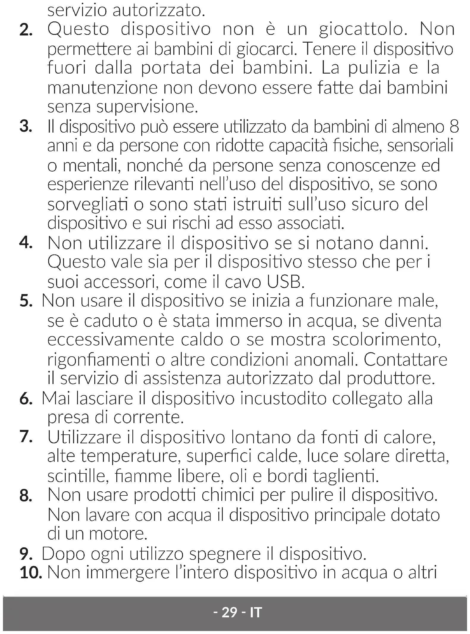 Questo dispositivo non è un giocattolo. Non permeere ai bambini di giocarci. Tenere il disposivo fuori dalla portata dei bambini. La pulizia e la manutenzione non devono essere fae dai bambini senza supervisione.