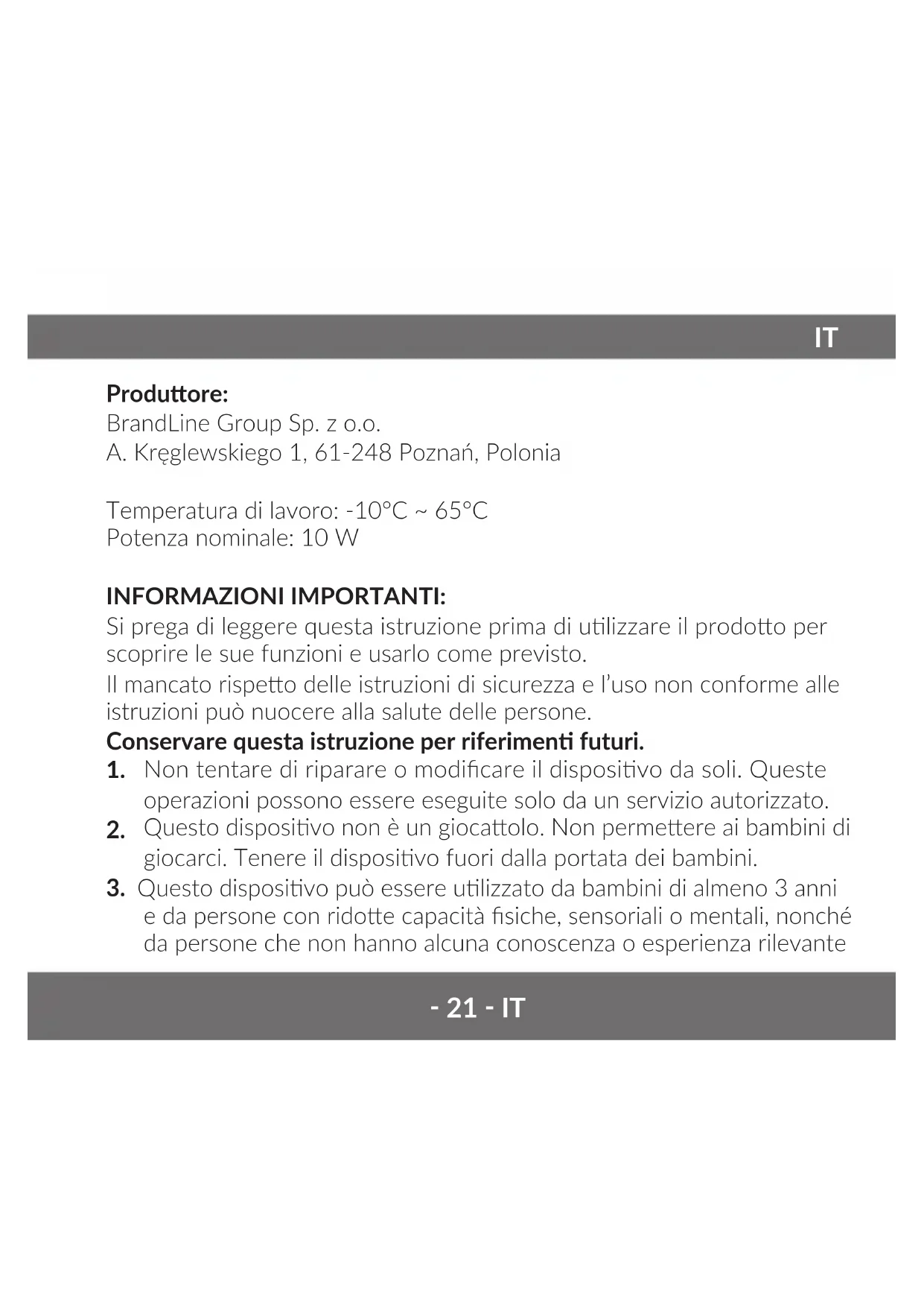 Фотографии носят иллюстративный характер, внешний вид изделий может отличаться от представленного на фотографиях.‑ 21 ‑ IT Produore: BrandLine Group Sp. z o.o. A. Kręglewskiego 1, 61-248 Poznań, Polonia Temperatura di lavoro: -10°C ~ 65°C Potenza nominale: 10 W INFORMAZIONI IMPORTANTI: Si prega di leggere questa istruzione prima di ulizzare il prodoo per scoprire le sue funzioni e usarlo come previsto. Il mancato rispeo delle istruzioni di sicurezza e l’uso non conforme alle istruzioni può nuocere alla salute delle persone. Conservare questa istruzione per riferimen futuri.
