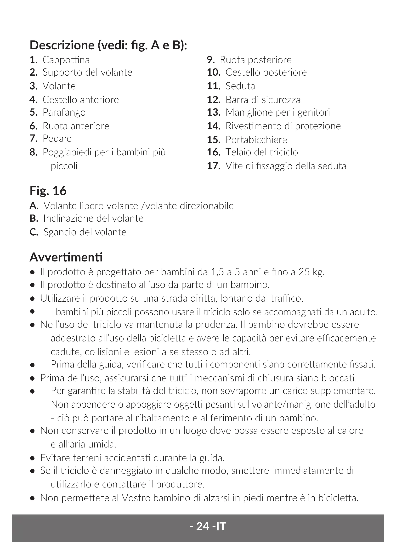 J. Montare un portabicchieri sul maniglione per i genitori (g. 15). Ulizzo Sedersi sulla seduta, allacciare le cinture di sicurezza, aerrare entrambi i manubri del volante e poi pedalare per meere in moto il triciclo. Ruotare il volante nella direzione desiderata. Frenare fermando il pedale Regolazione Bloccaggio dei pedali – funzione di ruota libera Un triciclo a tre ruote ha una funzione di ruota libera. Quando si ulizza questa‑ 26 ‑IT funzione, il bambino può pedalare indipendentemente dalla velocità del triciclo. Per impostare questa congurazione, spostare la leva sul lato della ruota. Se si desidera che il movimento dei pedali mea in moto la ruota, spostare di nuovo la leva. Se il bambino usa un triciclo da solo, assicurarsi che la funzione di sblocco ruote sia disabilitata. Bloccaggio del volante Per bloccare il volante premere il pulsante, indicato in g. 16. Il pulsante bloccato unirà il volante con la ruota, lo spostamento nell’altra direzione sbloccherà e permeerà al bambino di usare il volante come un giocaolo, senza inuenzare la traieoria di guida. È anche possibile inclinare il volante (vedi Regolazione dello schienale della seduta). Triciclo autonomo Il prodoo può essere ulizzato senza il maniglione per i genitori come triciclo autonomo per il bambino. Per smontare: inclinare la leva nella parte inferiore dell’impugnatura e poi far uscire fuori l’elemento. Proteggere il perno metallico che sporge dal telaio della biciclea con un rivesmento di protezione (contrassegnato come 14 nella gura B). Regolazione dello schienale della seduta Per impostare lo schienale in una delle tre posizioni disponibili, ulizzare la clip sul retro dello schienale. Un clic acusco indica che lo schienale è correamente bloccato. È possibile scegliere tra tre posizioni di schienale rivolto all’indietro e in avan verso il senso di marcia. Lo schienale può anche essere ripiegato in avan per il trasporto. Cambiando l’angolo di inclinazione dello schienale della seduta rivolto all’indietro, ripiegare prima il volante. A tal ne, premere il tasto contrassegnato con B in gura 16 e inclinare il volante. Regolazione della seduta in avan – all’dietro Per regolare la posizione, allentare la vite sul fondo della seduta. Dopo aver impostato la posizione desiderata, serrare nuovamente la vite.‑ 27 ‑ IT Regolazione dell’altezza dell’impugnatura Regolare l’altezza dell’impugnatura premendo il bloccaggio sulla sua parte superiore. È possibile una regolazione a 3 stadi. Bloccaggio delle ruote posterio Per bloccare le ruote posteriori premere con il piede entrambi i freni. Smontaggio e trasporto Per ripiegare il disposivo: