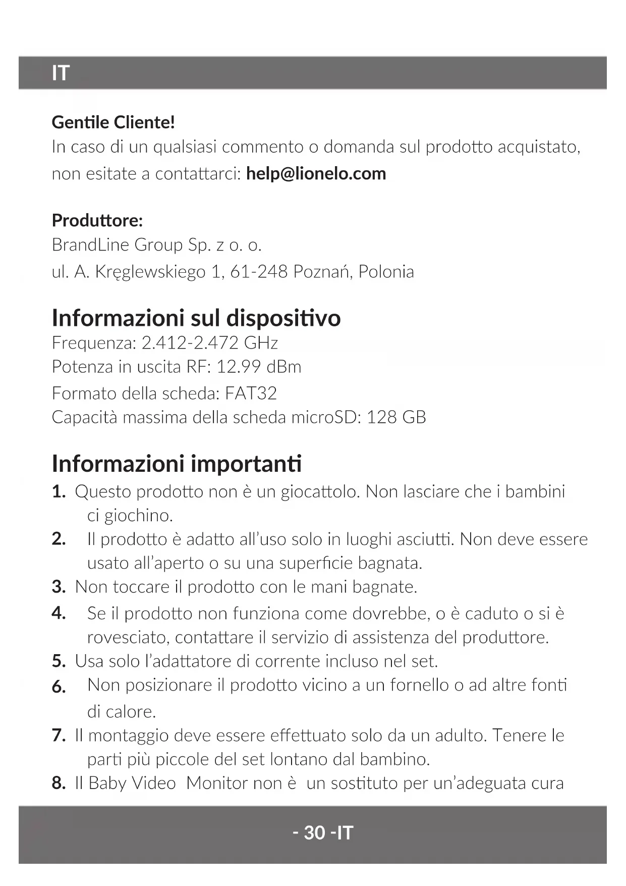 Genle Cliente! In caso di un qualsiasi commento o domanda sul prodoo acquistato, non esitate a contaarci: help@lionelo.com Produore: BrandLine Group Sp. z o. o. ul. A. Kręglewskiego 1, 61-248 Poznań, Polonia Informazioni sul disposivo Frequenza: 2.412-2.472 GHz Potenza in uscita RF: 12.99 dBm Formato della scheda: FAT32 Capacità massima della scheda microSD: 128 GB Informazioni importan