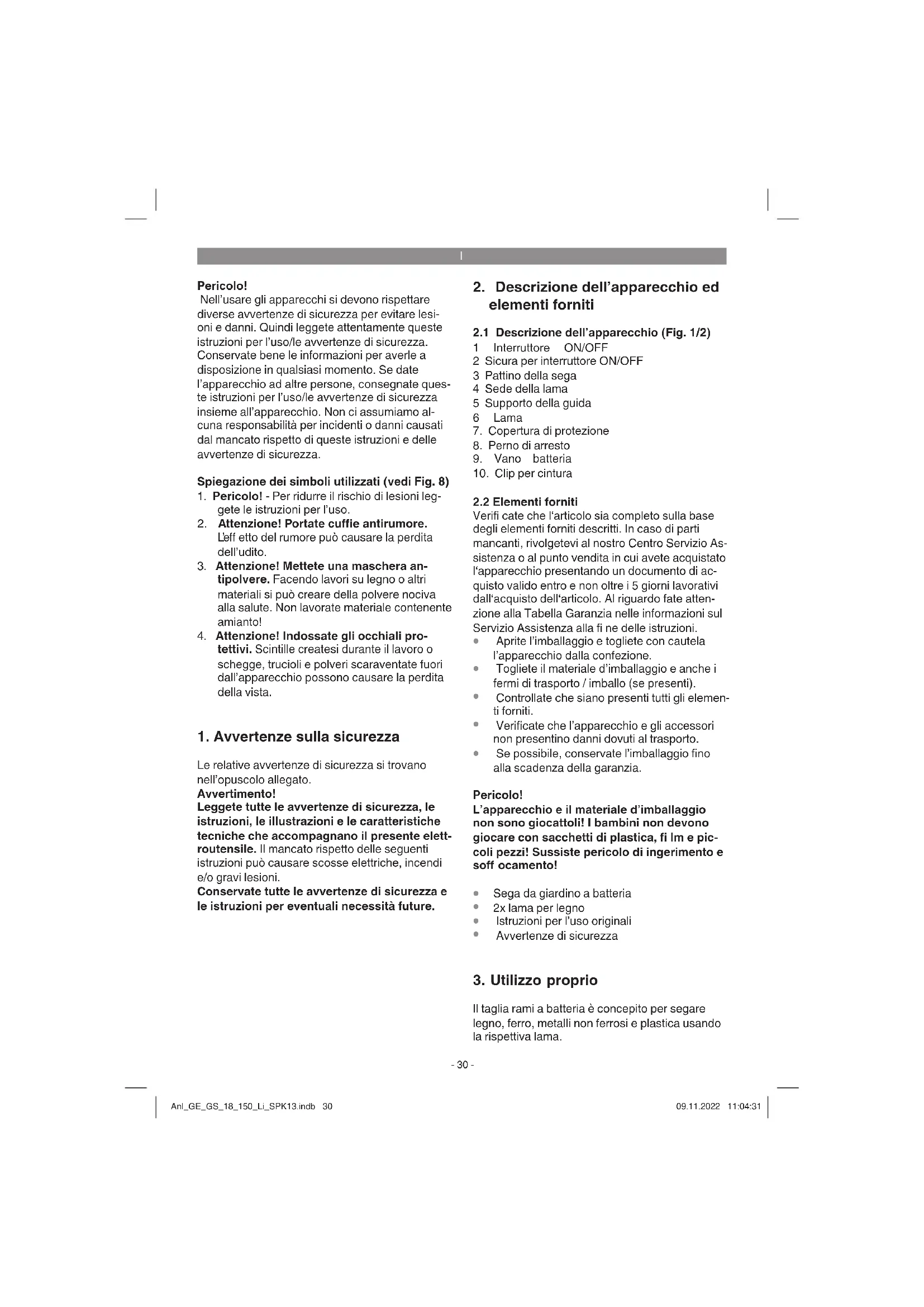 Il taglia rami a batteria è concepito per segare legno, ferro, metalli non ferrosi e plastica usando la rispettiva lama. Anl_GE_GS_18_150_Li_SPK13.indb 30Anl_GE_GS_18_150_Li_SPK13.indb 30 09.11.2022 11:04:3109.11.2022 11:04:31I