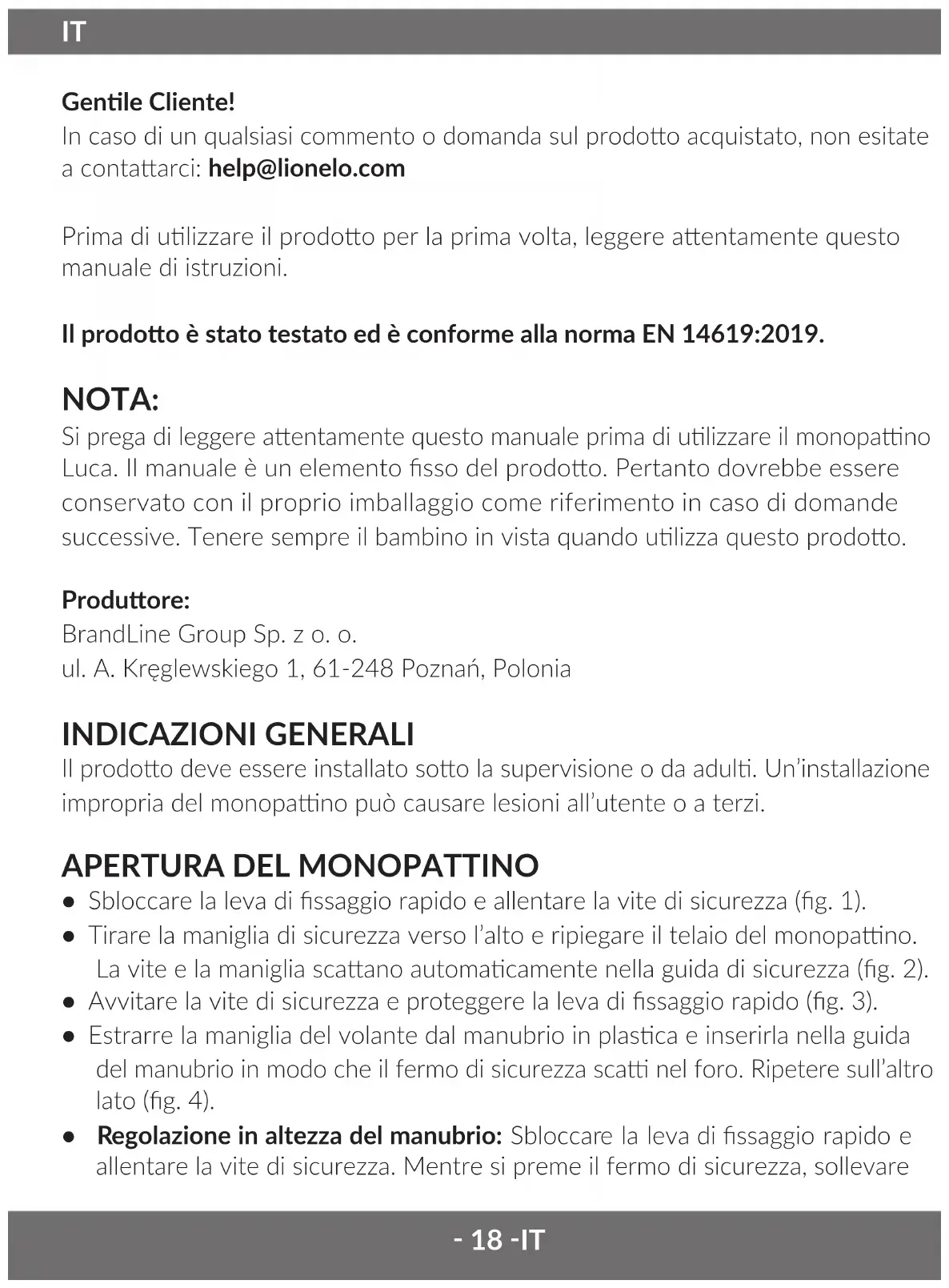 Genle Cliente! In caso di un qualsiasi commento o domanda sul prodoo acquistato, non esitate a contaarci: help@lionelo.com Prima di ulizzare il prodoo per la prima volta, leggere aentamente questo manuale di istruzioni. Il prodoo è stato testato ed è conforme alla norma EN 14619:2019. NOTA: Si prega di leggere aentamente questo manuale prima di ulizzare il monopano Luca. Il manuale è un elemento sso del prodoo. Pertanto dovrebbe essere conservato con il proprio imballaggio come riferimento in caso di domande successive. Tenere sempre il bambino in vista quando ulizza questo prodoo. Produore: BrandLine Group Sp. z o. o. ul. A. Kręglewskiego 1, 61-248 Poznań, Polonia INDICAZIONI GENERALI Il prodoo deve essere installato soo la supervisione o da adul. Un’installazione impropria del monopano può causare lesioni all’utente o a terzi.