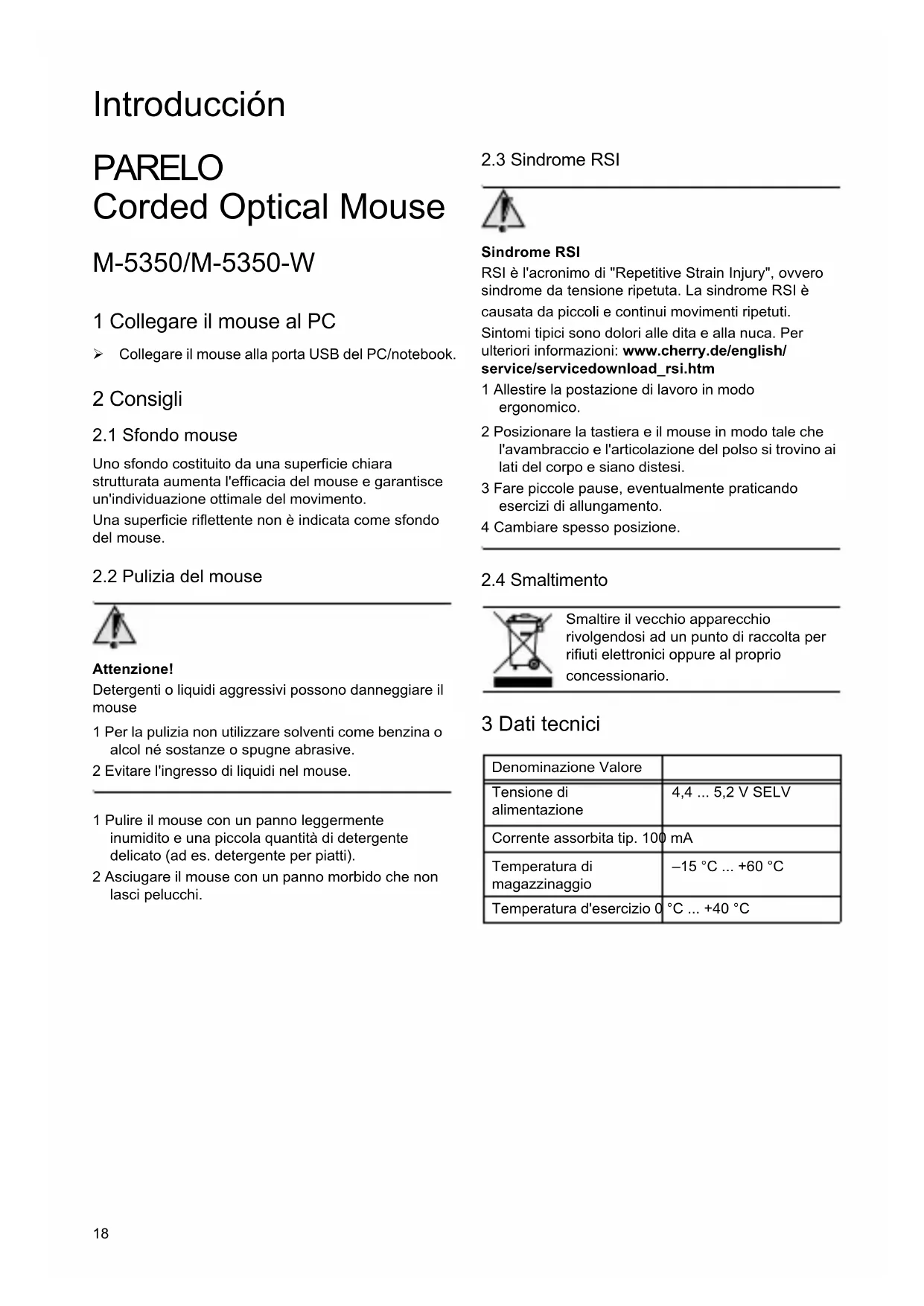 Scarica le istruzioni per il tuo Mouse per computer in formato PDF gratuitamente! Trova il tuo manuale PARELO - Cherry e riprendi in mano il tuo dispositivo elettronico. In questa pagina sono pubblicati tutti i documenti necessari per l'utilizzo del tuo dispositivo. PARELO del marchio Cherry.