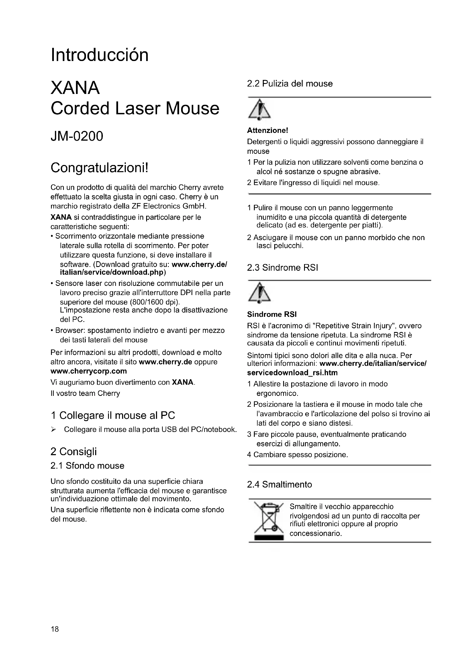 - Sistema operativo ed eventualmente versione installata di un service pack 5 Avvertenza generale per l'utente Cherry, un marchio della ZF Electronics GmbH, ottimizza costantemente i suoi prodotti al passo con lo sviluppo delle nuove tecnologie. Pertanto ci riserviamo il diritto di apportare modifiche tecniche. La determinazione dell'affidabilità e la definizione di dati tecnici avvengono in base ad un controllo eseguito internamente per conformarsi a norme e/o disposizioni riconosciute a livello internazionale. Requisiti diversi possono essere soddisfatti con la collaborazione reciproca. Una movimentazione o un magazzinaggio inopportuni, nonché influssi esterni possono causare anomalie e guasti durante l'uso. Non si assume alcuna garanzia per difetti riconducibili ad una modifica del prodotto realizzata dall'utente e non si risponde in caso di modifiche non autorizzate. Tutte le riparazioni devono essere effettuate dal nostro personale o una persona o un'organizzazione ufficialmente autorizzata. Denominazione Valore Tensione di alimentazione 4,5 ... 5,5 V SELV Corrente assorbita tip. 50 mA Temperatura di magazzinaggio –15 °C ... +60 °C Temperatura d'esercizio 0 °C ... +40 °C Si esclude qualsiasi diritto di compensazione per danni della ZF Electronics o dei suoi rappresentanti – indipendentemente dal motivo giuridico (comprese lesioni personali causate dallo stress) – qualora sia possibile escludere dolo, colpa grave o inosservanza di disposizioni coercitive in tema di responsabilità del prodotto da parte nostra oppure in caso di lesioni personali. Le presenti istruzioni sono valide soltanto per il prodotto a cui si riferiscono. Ulteriori informazioni a riguardo sono reperibili presso i nostri distributori o direttamente presso di noi. Prodotto al laser di classe 1 EN 60825-1:2007 Sicuro in presenza di condizioni ragionevolmente prevedibili. Possibili danni causati dal laser in caso di mouse difettoso Il raggio laser è invisibile. In caso di mouse difettoso il raggio laser può intensificarsi. 1 Se si riscontra un difetto, non guardare direttamente nell'apertura del laser nella parte inferiore del mouse. 2 Spegnere immediatamente il mouse difettoso. 3 Portare il mouse difettoso dal proprio rivenditore per la riparazione oppure smaltirlo ad un punto di raccolta per rifiuti oppure al proprio rivenditore. 4 Per ulteriori informazioni visitare il sito Internet: www.cherry.de/italian/service/ service_Laser_classe_1.htm 6 Dichiarazione di conformità CE La ZF Electronics GmbH dichiara che il prodotto XANA (JM-02) è conforme alle seguenti norme: