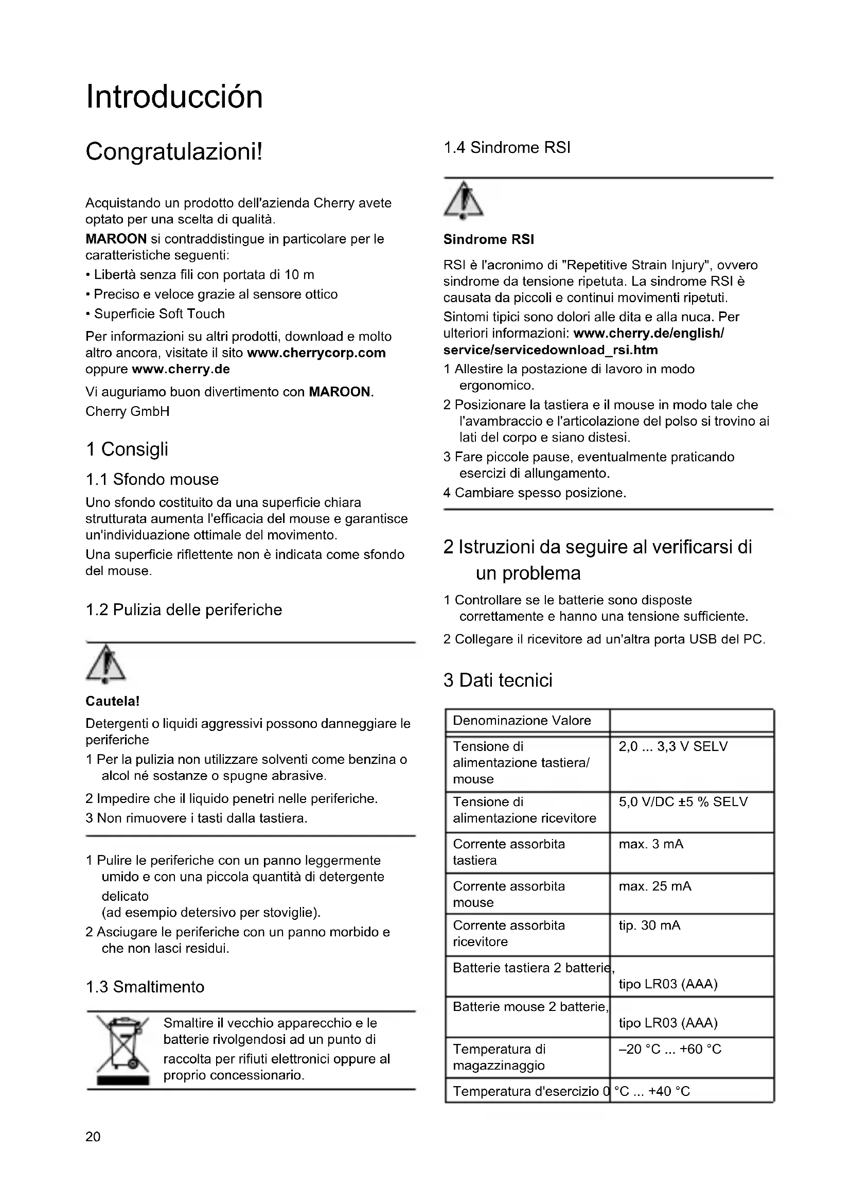 Sindrome RSI RSI è l'acronimo di "Repetitive Strain Injury", ovvero sindrome da tensione ripetuta. La sindrome RSI è causata da piccoli e continui movimenti ripetuti. Sintomi tipici sono dolori alle dita e alla nuca. Per ulteriori informazioni: www.cherry.de/english/ service/servicedownload_rsi.htm 1 Allestire la postazione di lavoro in modo ergonomico. 2 Posizionare la tastiera e il mouse in modo tale che l'avambraccio e l'articolazione del polso si trovino ai lati del corpo e siano distesi. 3 Fare piccole pause, eventualmente praticando esercizi di allungamento. 4 Cambiare spesso posizione. 2 Istruzioni da seguire al verificarsi di un problema 1 Controllare se le batterie sono disposte correttamente e hanno una tensione sufficiente. 2 Collegare il ricevitore ad un'altra porta USB del PC. 3 Dati tecnici Denominazione Valore Tensione di alimentazione tastiera/ mouse 2,0 ... 3,3 V SELV Tensione di alimentazione ricevitore