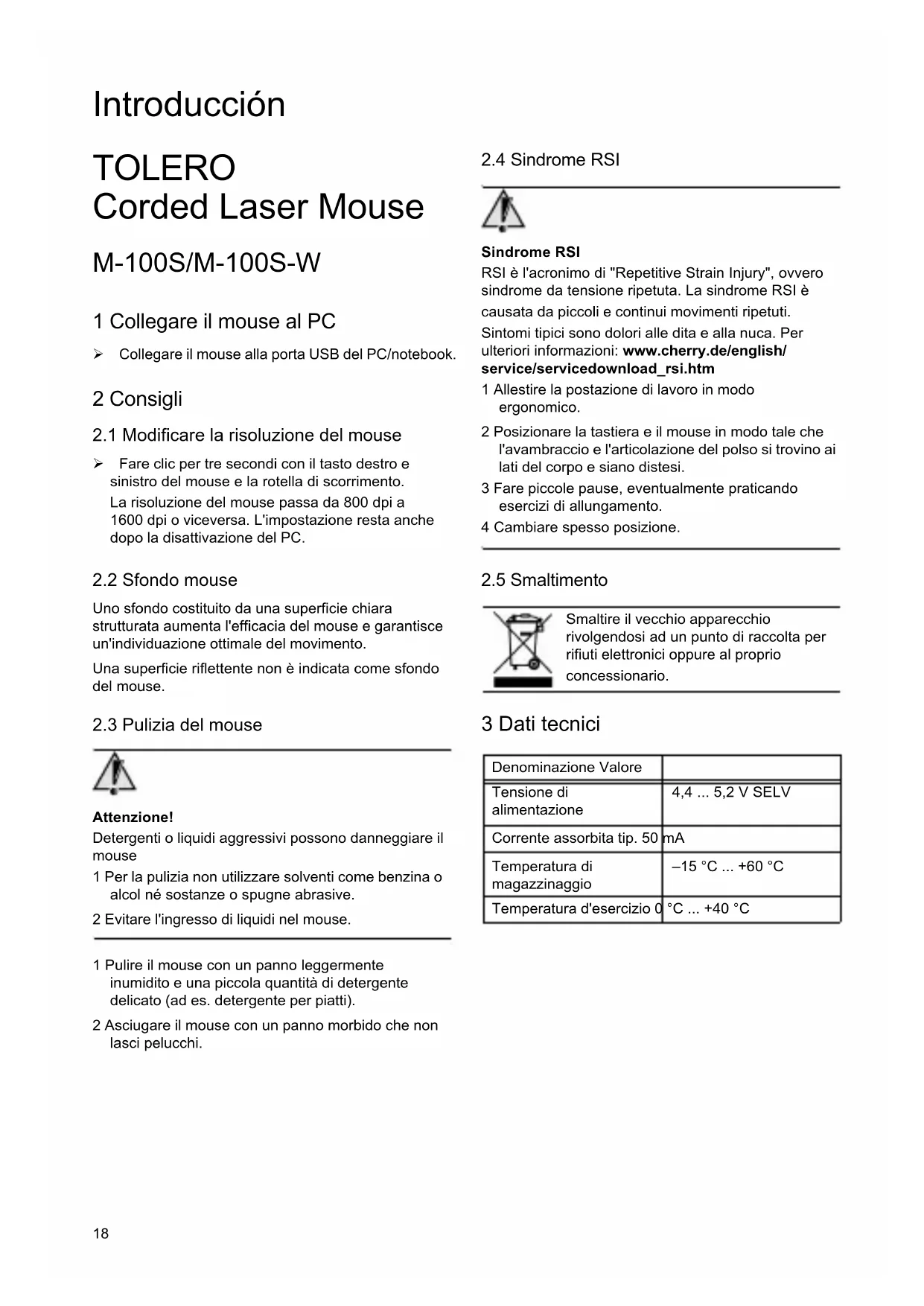 Scarica le istruzioni per il tuo Mouse per computer in formato PDF gratuitamente! Trova il tuo manuale TOLERO - Cherry e riprendi in mano il tuo dispositivo elettronico. In questa pagina sono pubblicati tutti i documenti necessari per l'utilizzo del tuo dispositivo. TOLERO del marchio Cherry.