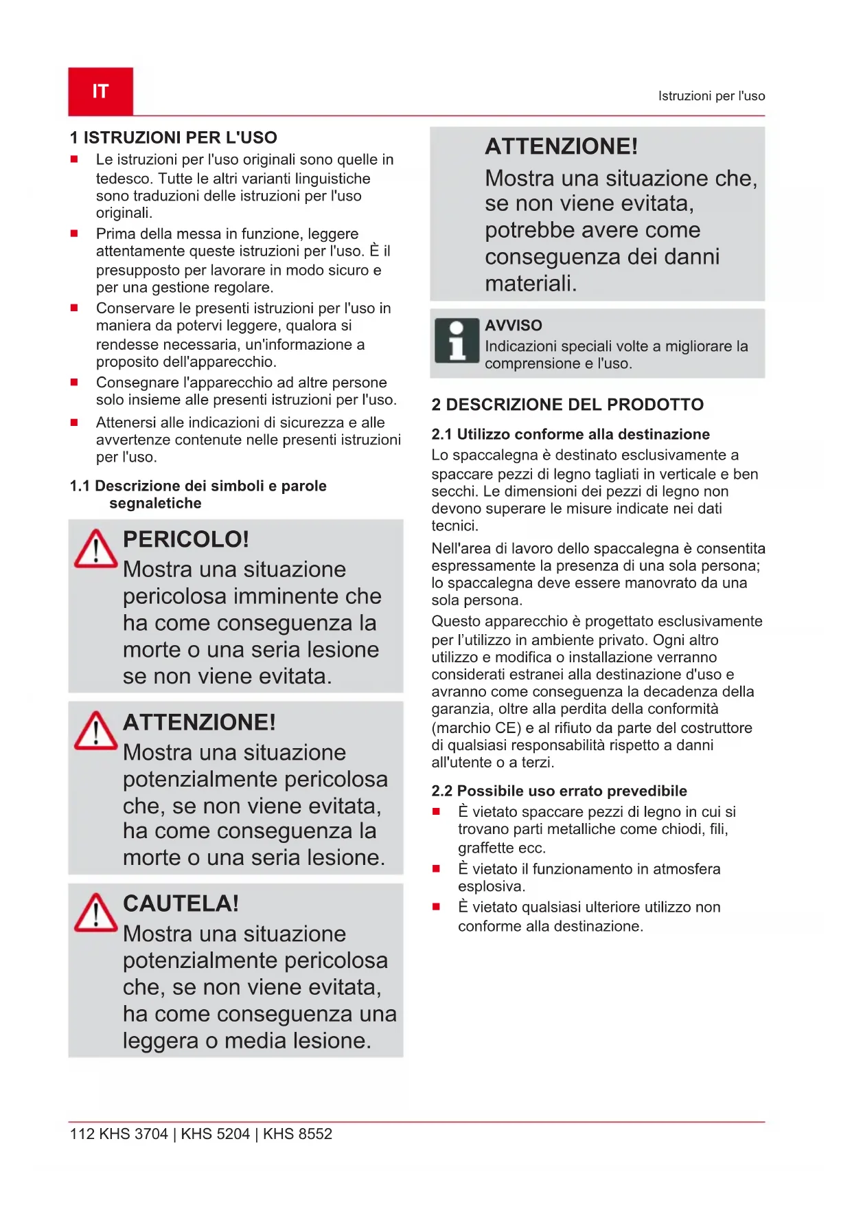 Simbolo Significato Prima di mettere in funzione leggere il libretto di istruzioni! Tenere lontane terze persone dalla zona di pericolo! Attenzione, pericolo! Non avvicinare le mani al cuneo di taglio! Scollegare l'apparecchio dall'alimentazione di rete prima di interventi di manutenzione! Simbolo Significato Indossare guanti di protezione! Indossare calzature antinfortunistiche! Indossare occhiali di protezione!462706_l 115 Indicazioni di sicurezza Simbolo Significato Utilizzare l'apparecchio con entrambe le mani! 3 INDICAZIONI DI SICUREZZA PERICOLO! Pericolo di morte e rischio di lesioni gravissime a causa di mancata conoscenza delle istruzioni di sicurezza La mancata conoscenza delle istruzioni di sicurezza e di utilizzo può causare incidenti gravissimi e anche fatali.
