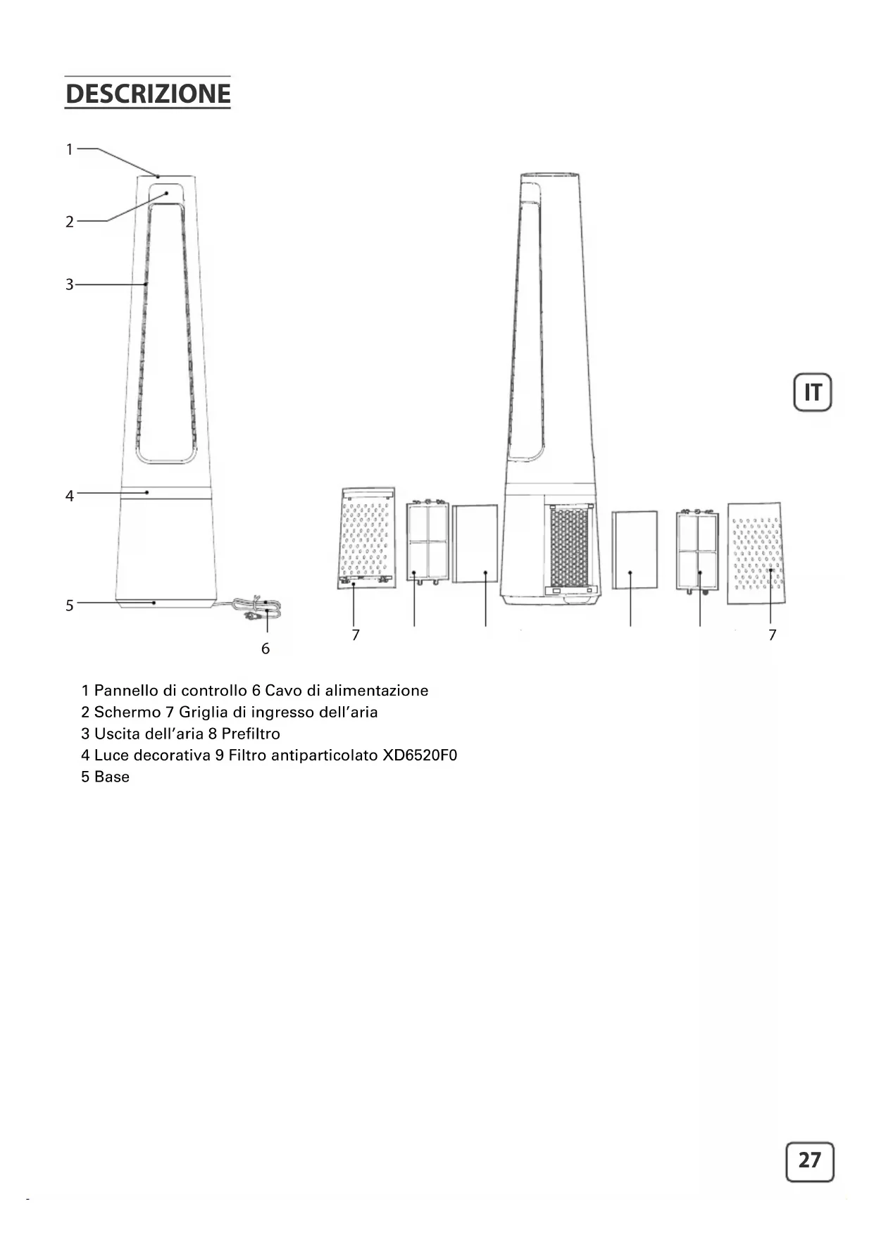 1 Pannello di controllo 6 Cavo di alimentazione 2 Schermo 7 Griglia di ingresso dell’aria 3 Uscita dell’aria 8 Preltro 4 Luce decorativa 9 Filtro antiparticolato XD6520F0 5 Base