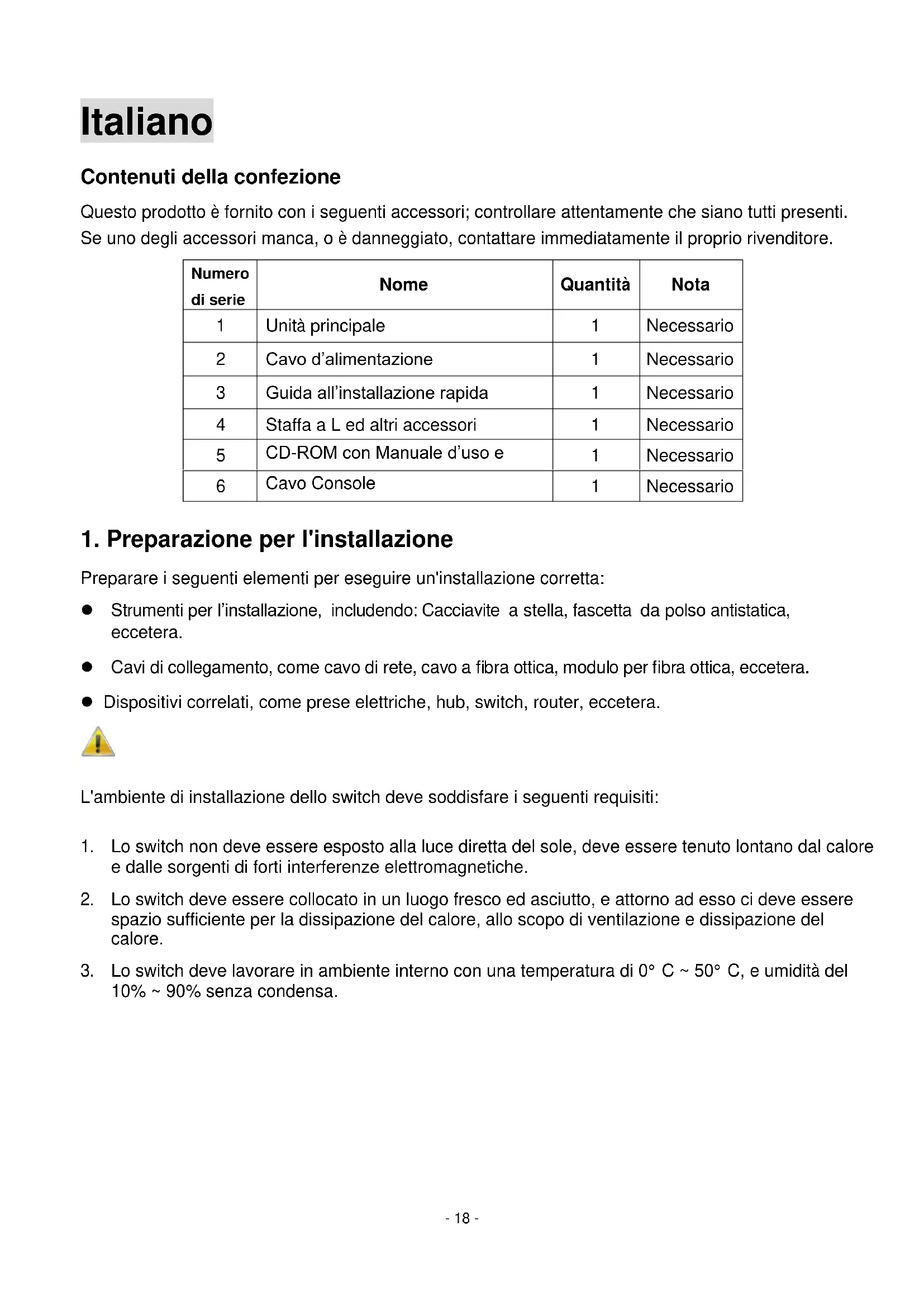 Lo switch deve lavorare in ambiente interno con una temperatura di 0° C ~ 50° C, e umidità del 10% ~ 90% senza condensa.- 19 -