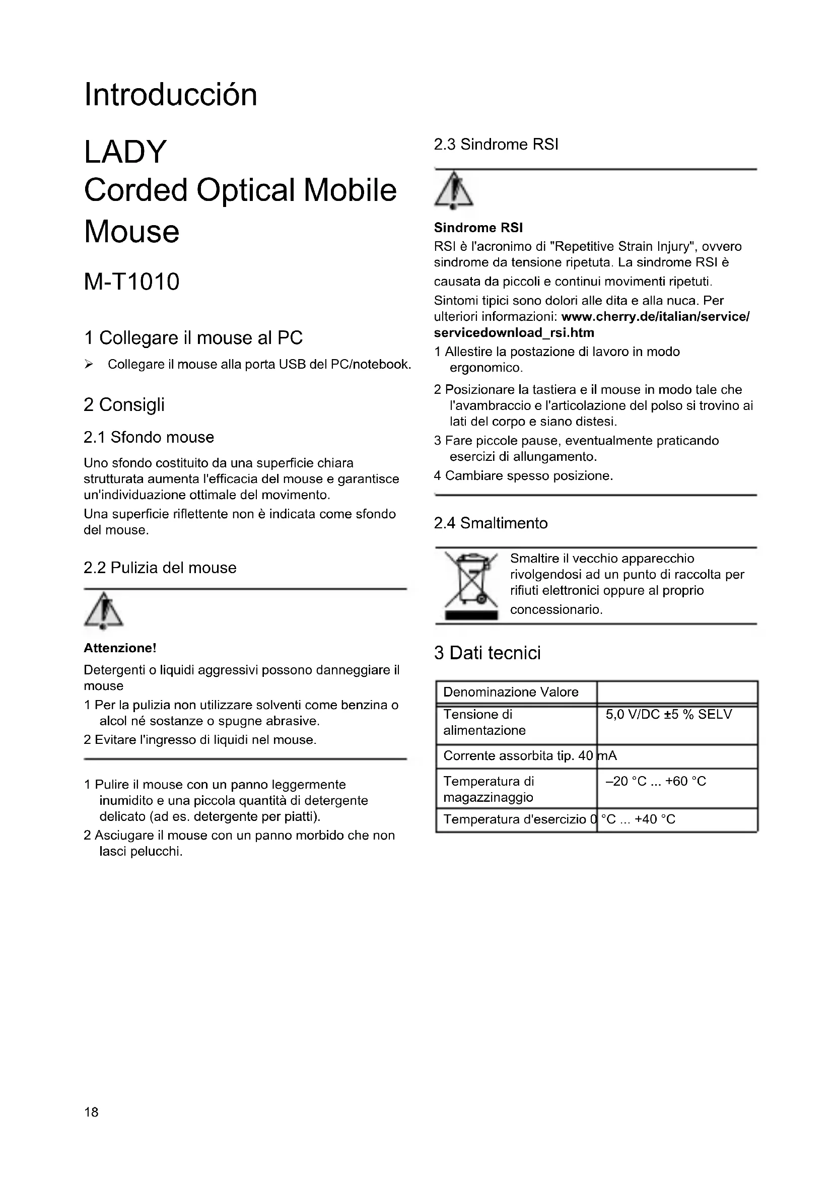 Scarica le istruzioni per il tuo Mouse per computer in formato PDF gratuitamente! Trova il tuo manuale LADY MT1010 - Cherry e riprendi in mano il tuo dispositivo elettronico. In questa pagina sono pubblicati tutti i documenti necessari per l'utilizzo del tuo dispositivo. LADY MT1010 del marchio Cherry.