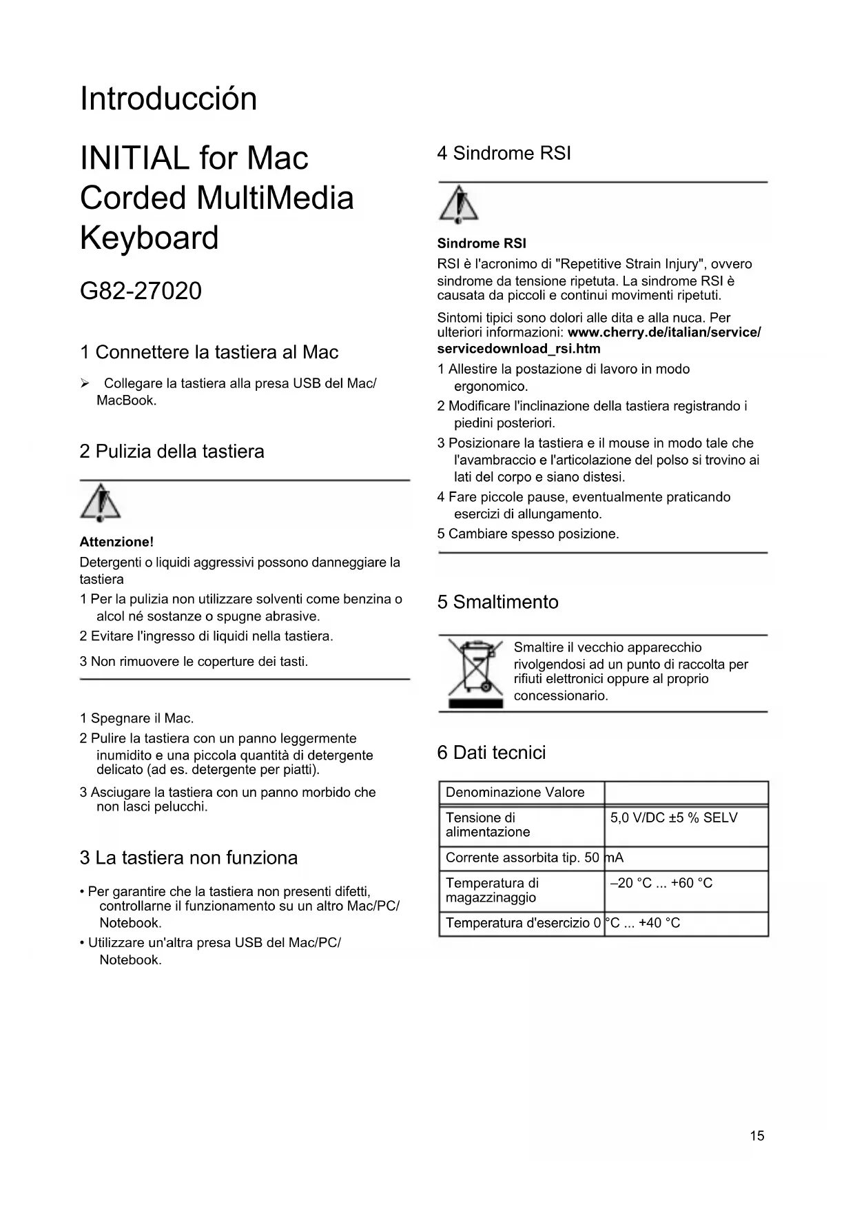 - Utilizzare un'altra presa USB del Mac/PC/ Notebook. 4 Sindrome RSI Sindrome RSI RSI è l'acronimo di "Repetitive Strain Injury", ovvero sindrome da tensione ripetuta. La sindrome RSI è causata da piccoli e continui movimenti ripetuti. Sintomi tipici sono dolori alle dita e alla nuca. Per ulteriori informazioni: www.cherry.de/italian/service/ servicedownload_rsi.htm 1 Allestire la postazione di lavoro in modo ergonomico. 2 Modificare l'inclinazione della tastiera registrando i piedini posteriori. 3 Posizionare la tastiera e il mouse in modo tale che l'avambraccio e l'articolazione del polso si trovino ai lati del corpo e siano distesi. 4 Fare piccole pause, eventualmente praticando esercizi di allungamento. 5 Cambiare spesso posizione. 5 Smaltimento 6 Dati tecnici Smaltire il vecchio apparecchio rivolgendosi ad un punto di raccolta per rifiuti elettronici oppure al proprio concessionario. Denominazione Valore Tensione di alimentazione