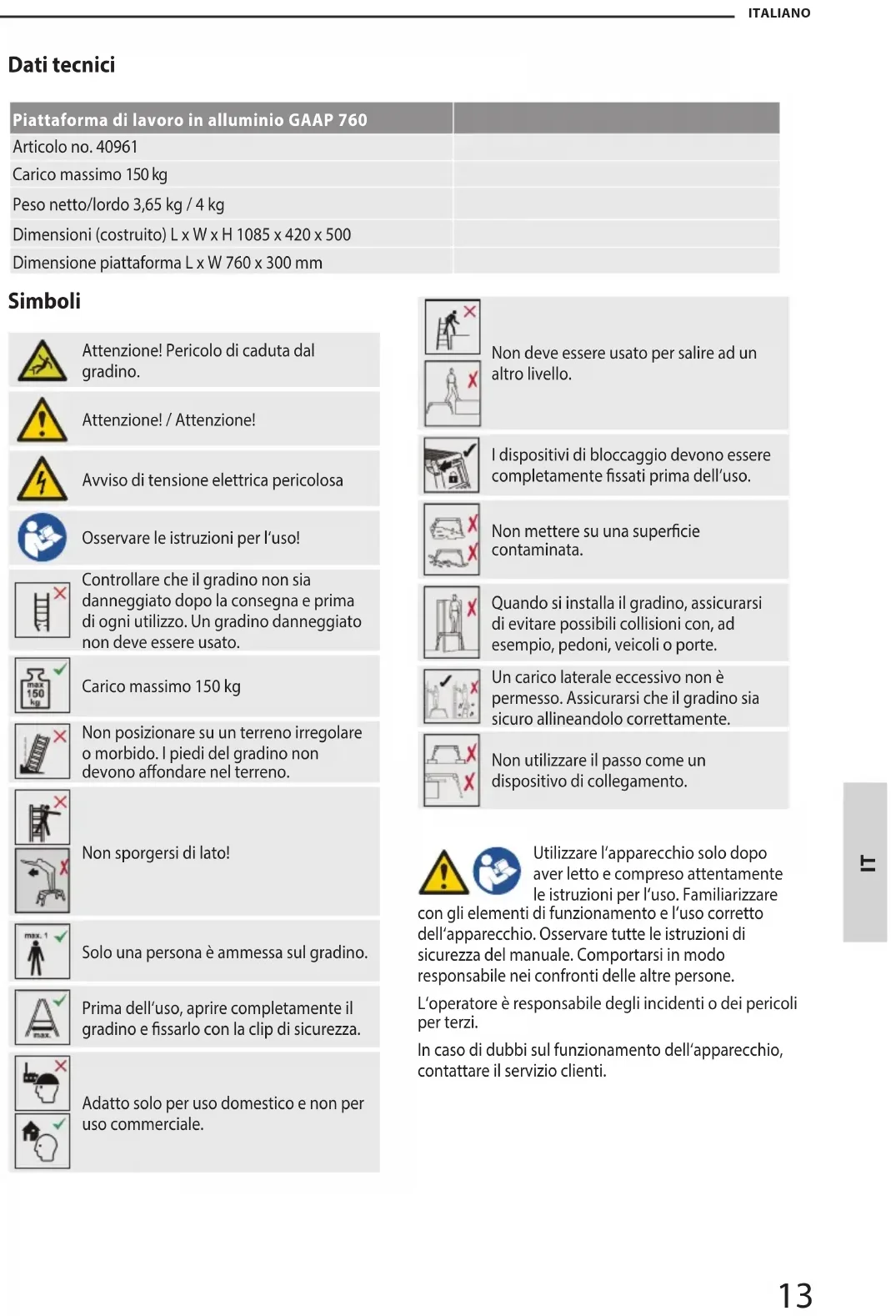 ITALIANO Uso previsto Questa piattaforma di lavoro è un‘attrezzatura di lavoro mobile che può essere utilizzata in un‘ampia varietà di luoghi. Può essere usato per eseguire piccoli lavori in altezza dove l‘uso di altre attrezzature di lavoro non è proporzionato (vedi Ordinanza sulla sicurezza delle attrezzature operative). La piattaforma di lavoro deve essere usata solo come descritto in queste istruzioni per l‘uso; qualsiasi altro uso è considerato improprio. Non si accetta alcuna responsabilità per danni causati da un uso improprio. Le modiche al gradino che non sono autorizzate dal produttore invalidano la garanzia. Istruzioni di sicurezza per scale e gradini (piattaforme di lavoro)