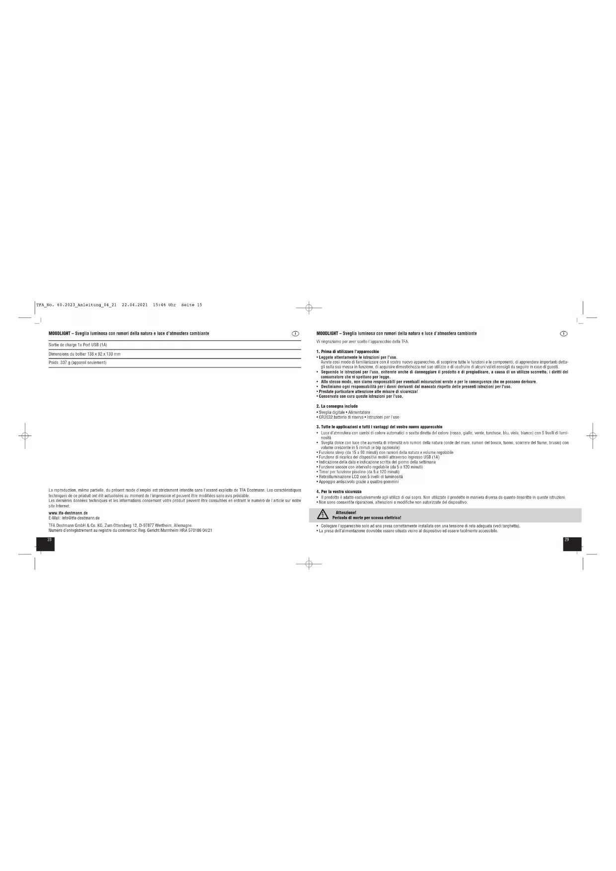 - Het stopcontact moet zich dicht bij de apparatuur bevinden en gemakkelijk toegankelijk zijn. Dimensioni esterne 138 x 92 x 139 mm Peso 337 g (solo apparecchio) È vietata la pubblicazione delle presenti istruzioni o di parti di esse senza una precedente autorizzazione della TFA Dostmann. I dati tecnici corrispon- dono allo stato del prodotto al momento della stampa e possono cambiare senza preavviso. È possibile trovare dati tecnici e informazioni aggiornate sul prodotto inserendo il numero di articolo sul nostro sito. www.tfa-dostmann.de E-Mail: info@tfa-dostmann.de TFA Dostmann GmbH & Co. KG, Zum Ottersberg 12, D-97877 Wertheim, Germania Numero di iscrizione nel registro delle imprese: Reg. Gericht Mannheim HRA 570186 04/21 TFA_No. 60.2023_Anleitung_04_21 22.04.2021 15:46 Uhr Seite 193938 MOODLIGHT – Licht alarmklok met natuurgeluiden en kleurvariaties-stemmingslicht