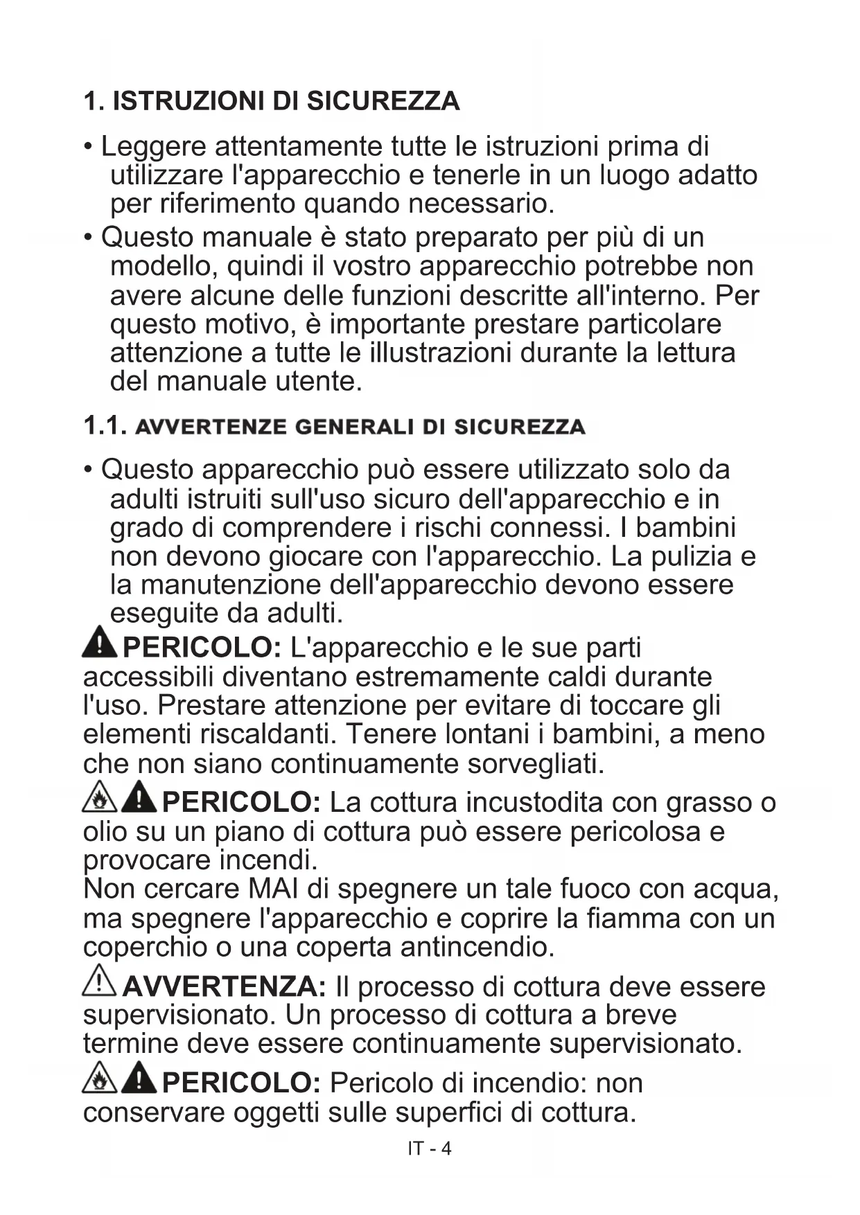 - Questo apparecchio può essere utilizzato solo da adulti istruiti sull'uso sicuro dell'apparecchio e in grado di comprendere i rischi connessi. I bambini non devono giocare con l'apparecchio. La pulizia e la manutenzione dell'apparecchio devono essere eseguite da adulti. PERICOLO: L'apparecchio e le sue parti accessibili diventano estremamente caldi durante l'uso. Prestare attenzione per evitare di toccare gli elementi riscaldanti. Tenere lontani i bambini, a meno che non siano continuamente sorvegliati. PERICOLO: La cottura incustodita con grasso o olio su un piano di cottura può essere pericolosa e provocare incendi. Non cercare MAI di spegnere un tale fuoco con acqua, ma spegnere l'apparecchio e coprire la fiamma con un coperchio o una coperta antincendio. AVVERTENZA: Il processo di cottura deve essere supervisionato. Un processo di cottura a breve termine deve essere continuamente supervisionato. PERICOLO: Pericolo di incendio: non conservare oggetti sulle superfici di cottura.IT - 5 PERICOLO: Se la superficie è incrinata, spegnere l'apparecchio per evitare la possibilità di scosse elettriche.