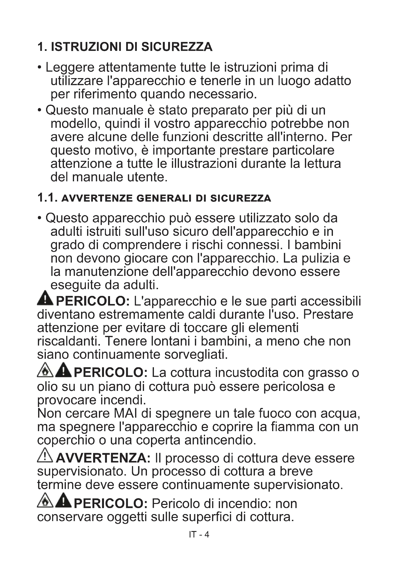 - Questo apparecchio può essere utilizzato solo da adulti istruiti sull'uso sicuro dell'apparecchio e in grado di comprendere i rischi connessi. I bambini non devono giocare con l'apparecchio. La pulizia e la manutenzione dell'apparecchio devono essere eseguite da adulti. PERICOLO: L'apparecchio e le sue parti accessibili diventano estremamente caldi durante l'uso. Prestare attenzione per evitare di toccare gli elementi riscaldanti. Tenere lontani i bambini, a meno che non siano continuamente sorvegliati. PERICOLO: La cottura incustodita con grasso o olio su un piano di cottura può essere pericolosa e provocare incendi. Non cercare MAI di spegnere un tale fuoco con acqua, ma spegnere l'apparecchio e coprire la fiamma con un coperchio o una coperta antincendio. AVVERTENZA: Il processo di cottura deve essere supervisionato. Un processo di cottura a breve termine deve essere continuamente supervisionato. PERICOLO: Pericolo di incendio: non conservare oggetti sulle superfici di cottura.IT - 5 PERICOLO: Se la superficie è incrinata, spegnere l'apparecchio per evitare la possibilità di scosse elettriche.