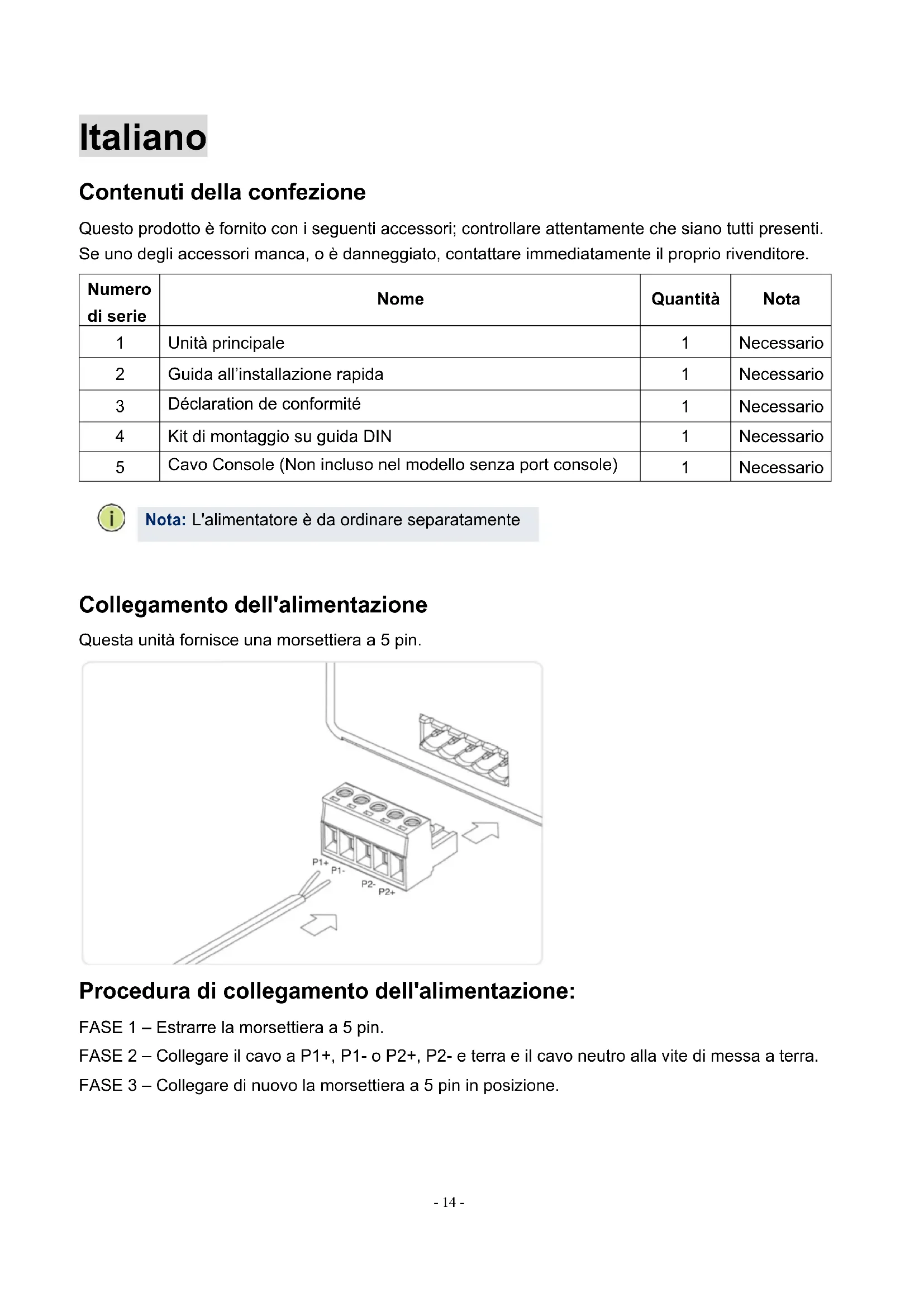 Collegamento dell'alimentazione Questa unità fornisce una morsettiera a 5 pin. Procedura di collegamento dell'alimentazione: FASE 1 – Estrarre la morsettiera a 5 pin. FASE 2 – Collegare il cavo a P1+, P1- o P2+, P2- e terra e il cavo neutro alla vite di messa a terra. FASE 3 – Collegare di nuovo la morsettiera a 5 pin in posizione. Nota: L'alimentatore è da ordinare separatamente- 15 -