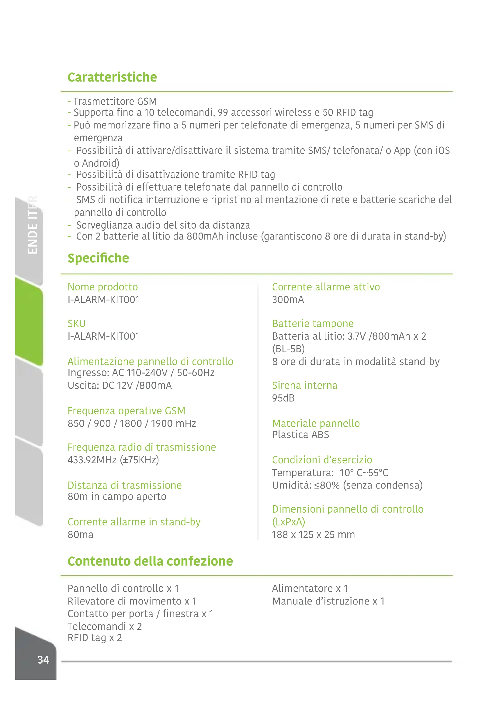 Caratteristiche - Trasmettitore GSM - Supporta no a 10 telecomandi, 99 accessori wireless e 50 RFID tag - Può memorizzare no a 5 numeri per telefonate di emergenza, 5 numeri per SMS di emergenza - Possibilità di attivare/disattivare il sistema tramite SMS/ telefonata/ o App (con iOS o Android) - Possibilità di disattivazione tramite RFID tag - Possibilità di eettuare telefonate dal pannello di controllo - SMS di notica interruzione e ripristino alimentazione di rete e batterie scariche del pannello di controllo - Sorveglianza audio del sito da distanza - Con 2 batterie al litio da 800mAh incluse (garantiscono 8 ore di durata in stand-by) Speciche Nome prodotto I-ALARM-KIT001 SKU I-ALARM-KIT001 Alimentazione pannello di controllo Ingresso: AC 110-240V / 50-60Hz Uscita: DC 12V /800mA Frequenza operative GSM 850 / 900 / 1800 / 1900 mHz Frequenza radio di trasmissione 433.92MHz (±75KHz) Distanza di trasmissione 80m in campo aperto Corrente allarme in stand-by 80ma Corrente allarme attivo 300mA Batterie tampone Batteria al litio: 3.7V /800mAh x 2 (BL-5B) 8 ore di durata in modalità stand-by Sirena interna 95dB Materiale pannello Plastica ABS Condizioni d’esercizio Temperatura: -10° C~55°C Umidità: ≤80% (senza condensa) Dimensioni pannello di controllo (LxPxA) 188 x 125 x 25 mm Contenuto della confezione Pannello di controllo x 1 Rilevatore di movimento x 1 Contatto per porta / nestra x 1 Telecomandi x 2 RFID tag x 2 Alimentatore x 1 Manuale d’istruzione x 1ENDE ITFR