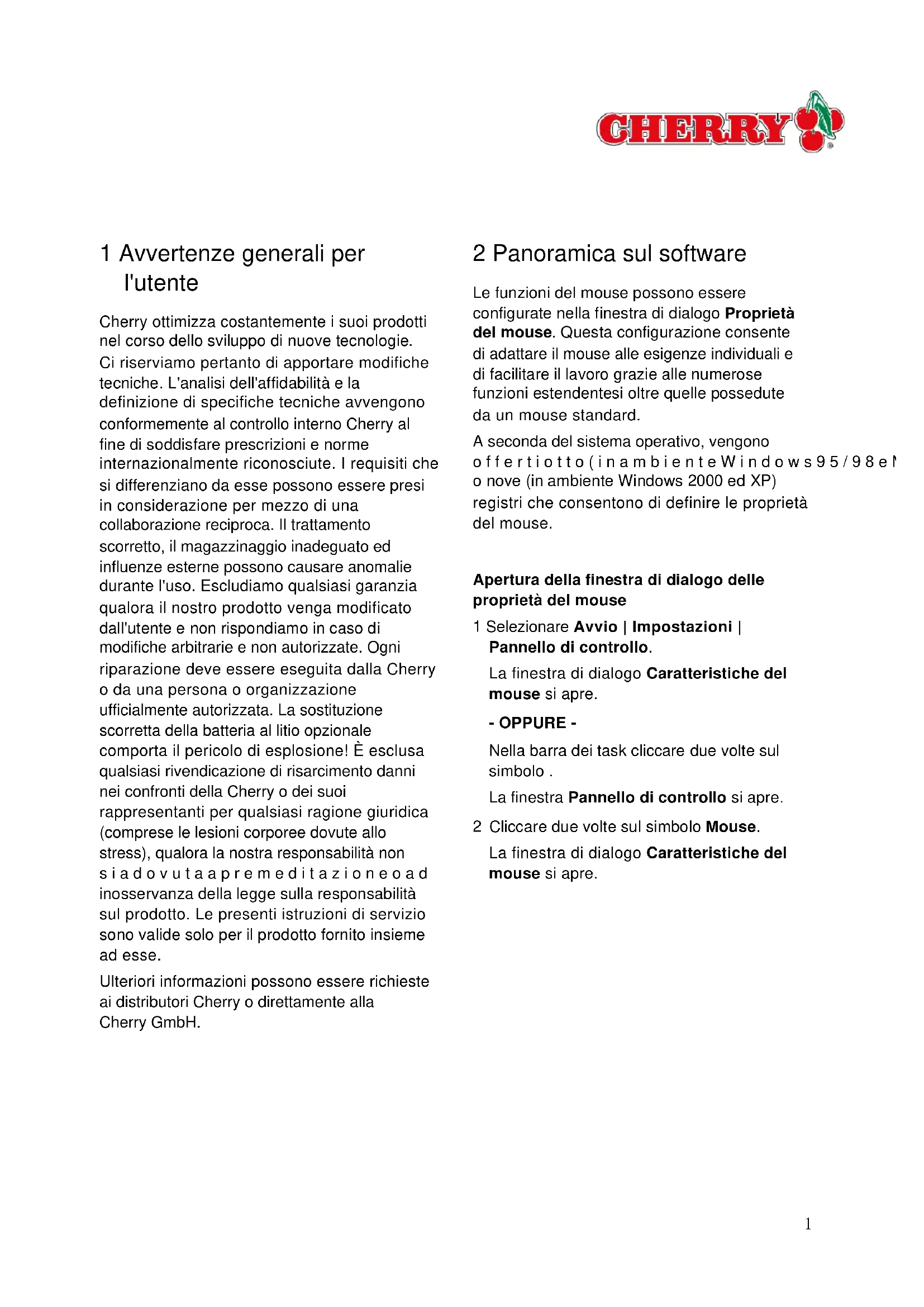 1 Sélectionnez dans le groupe Appareils la souris dont vous désirez consulter d'autres propriétés d'appareil. 2 Cliquezsurleboutondecommande Traitement de problème si vous désirez appeler l'aide de Windows 2000 sans autres informations sur la configuration matérielle. Le conseiller souris de l'aide de Windows 2000 est affiché. -OU- Cliquezsurleboutondecommande Propriétés. La fenêtre de dialogue Propriétés de… s'ouvre. Les onglets Généralités et Pilotes affichent le statut de l'appareil ainsi que des informations sur les pilotes. 3 Cliquezsurleboutondecommande Traitement de problème si un code d'erreur vous est affiché dans le champ Statut d'appareil. Le conseiller souris de l'aide de Windows 2000 est affiché.11 4 Etat de la pile de la souris (uniquement pour la version sans fil) Des symboles dans la ligne d'état vous informent de l'état de chargement de la pile de la souris. Le symbole signifie que la pile est pleine; le symbole signifie que la pile est déchargée.Cherry PowerWheel Mouse optical Cherry PowerWheel Mouse wireless optical Manuale 644-0273.00 März 20021 1 Avvertenze generali per l'utente Cherry ottimizza costantemente i suoi prodotti nel corso dello sviluppo di nuove tecnologie. Ci riserviamo pertanto di apportare modifiche tecniche. L'analisi dell'affidabilità e la definizione di specifiche tecniche avvengono conformemente al controllo interno Cherry al fine di soddisfare prescrizioni e norme internazionalmente riconosciute. I requisiti che si differenziano da esse possono essere presi in considerazione per mezzo di una collaborazione reciproca. Il trattamento scorretto, il magazzinaggio inadeguato ed influenze esterne possono causare anomalie durante l'uso. Escludiamo qualsiasi garanzia qualora il nostro prodotto venga modificato dall'utente e non rispondiamo in caso di modifiche arbitrarie e non autorizzate. Ogni riparazione deve essere eseguita dalla Cherry o da una persona o organizzazione ufficialmente autorizzata. La sostituzione scorretta della batteria al litio opzionale comporta il pericolo di esplosione! È esclusa qualsiasi rivendicazione di risarcimento danni nei confronti della Cherry o dei suoi rappresentanti per qualsiasi ragione giuridica (comprese le lesioni corporee dovute allo stress), qualora la nostra responsabilità non siadovutaapremeditazioneoad inosservanza della legge sulla responsabilità sul prodotto. Le presenti istruzioni di servizio sono valide solo per il prodotto fornito insieme ad esse. Ulteriori informazioni possono essere richieste ai distributori Cherry o direttamente alla Cherry GmbH. 2 Panoramica sul software Le funzioni del mouse possono essere configurate nella finestra di dialogo Proprietà del mouse. Questa configurazione consente di adattare il mouse alle esigenze individuali e di facilitare il lavoro grazie alle numerose funzioni estendentesi oltre quelle possedute da un mouse standard. A seconda del sistema operativo, vengono offertiotto(inambienteWindows95/98eME) o nove (in ambiente Windows 2000 ed XP) registri che consentono di definire le proprietà del mouse. Apertura della finestra di dialogo delle proprietà del mouse 1 Selezionare Avvio | Impostazioni | Pannello di controllo. La finestra di dialogo Caratteristiche del mouse si apre. - OPPURE - Nella barra dei task cliccare due volte sul simbolo . La finestra Pannello di controllo si apre. 2 Cliccare due volte sul simbolo Mouse. La finestra di dialogo Caratteristiche del mouse si apre.2 3Registri