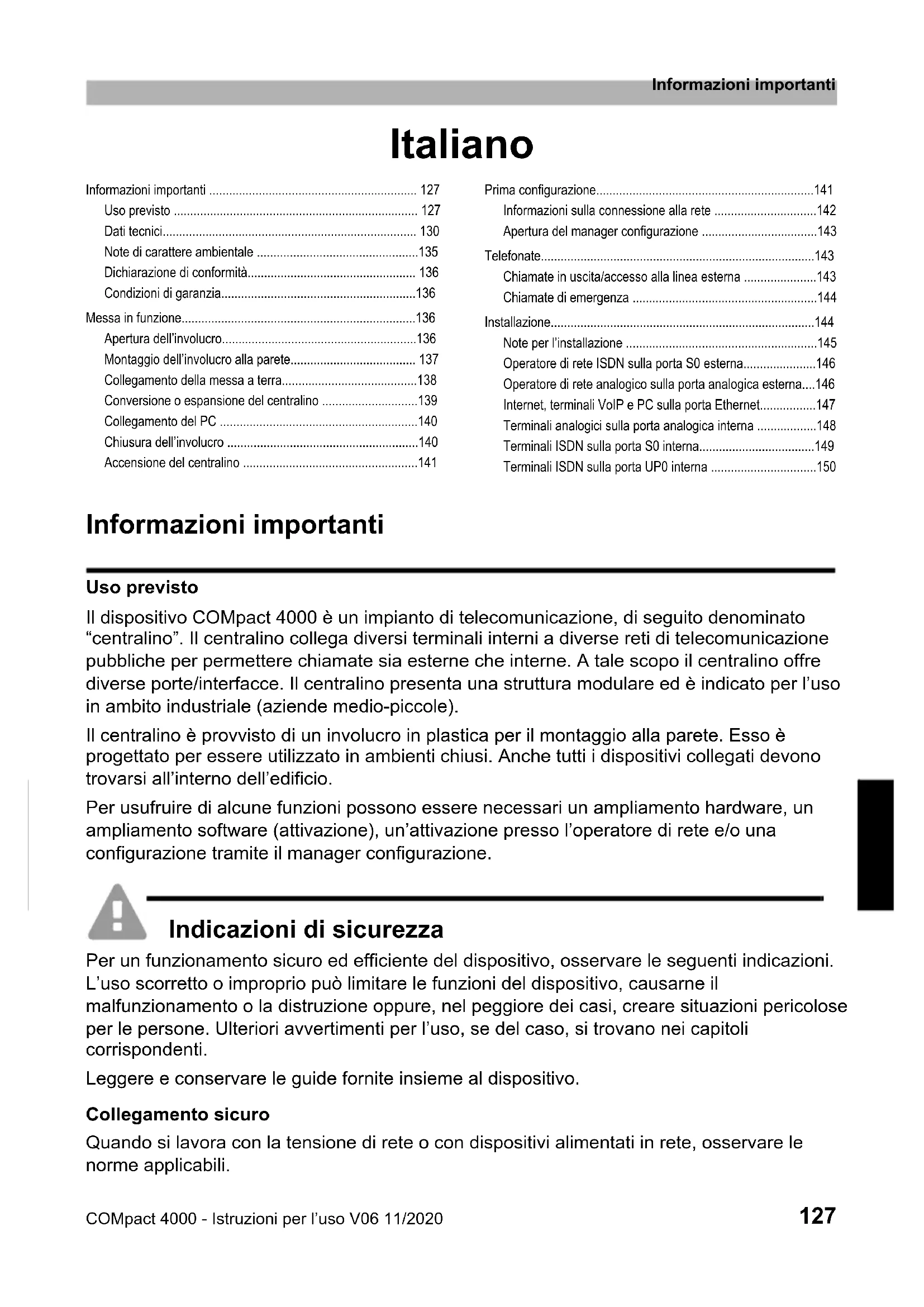 - Terminali ISDN sulla porta UP0 interna Informazioni importanti Uso previsto Il dispositivo COMpact 4000 è un impianto di telecomunicazione, di seguito denominato “centralino”. Il centralino collega diversi terminali interni a diverse reti di telecomunicazione pubbliche per permettere chiamate sia esterne che interne. A tale scopo il centralino offre diverse porte/interfacce. Il centralino presenta una struttura modulare ed è indicato per l’uso in ambito industriale (aziende medio-piccole). Il centralino è provvisto di un involucro in plastica per il montaggio alla parete. Esso è progettato per essere utilizzato in ambienti chiusi. Anche tutti i dispositivi collegati devono trovarsi all’interno dell’edificio. Per usufruire di alcune funzioni possono essere necessari un ampliamento hardware, un ampliamento software (attivazione), un’attivazione presso l’operatore di rete e/o una configurazione tramite il manager configurazione. Indicazioni di sicurezza Per un funzionamento sicuro ed efficiente del dispositivo, osservare le seguenti indicazioni. L’uso scorretto o improprio può limitare le funzioni del dispositivo, causarne il malfunzionamento o la distruzione oppure, nel peggiore dei casi, creare situazioni pericolose per le persone. Ulteriori avvertimenti per l’uso, se del caso, si trovano nei capitoli corrispondenti. Leggere e conservare le guide fornite insieme al dispositivo. Collegamento sicuro Quando si lavora con la tensione di rete o con dispositivi alimentati in rete, osservare le norme applicabili.Informazioni importanti 128 COMpact 4000 - Istruzioni per l’uso V06 11/2020 Collegare il dispositivo come descritto nelle presenti istruzioni. Rispettare i dati tecnici riportati sulla targhetta e nelle presenti istruzioni. Collegare il cavo del dispositivo solo a prese idonee e installate a regola d’arte. Tutti i cavi dell’edificio devono essere posati da un elettricista qualificato. Utilizzare esclusivamente accessori e ricambi originali. È consentito lavorare sui componenti attivi e pericolosi al contatto solo in condizioni di assenza di tensione. Allo stesso modo, è consentito lavorare in prossimità dei componenti attivi solo in condizioni di assenza di tensione o qualora tali componenti siano stati protetti adeguatamente contro il contatto diretto. Prima che un elettricista qualificato apra l’involucro per montare moduli aggiuntivi o eseguire collegamenti e commutazioni, staccare la spina del centralino. I dispositivi devono essere scollegati anche da eventuali sorgenti di corrente aggiuntive (per es. gruppi di continuità), se presenti. Attendere lo scaricamento di eventuali condensatori. Il condensatore di carica dell’alimentatore o della tensione suoneria può rimanere carico per molto tempo anche dopo avere staccato la spina o in mancanza di tensione. Durante un temporale non toccare il centralino e i dispositivi a esso collegati. Prima di toccare le schede con le mani o con un utensile, dissipare l’elettricità statica accumulata sulla propria persona. A tale scopo toccare un oggetto metallico possibilmente collegato a terra, per es. il morsetto di terra del centralino o il case di un PC. Tutti i cavi dell’edificio, anche quelli diretti al posto esterno, devono essere posati da un elettricista qualificato. Funzionamento sicuro Utilizzare il dispositivo solo con l’involucro chiuso. Alcuni interventi di installazione e manutenzione richiedono l’apertura del centralino durante il funzionamento (possono essere eseguiti solo da elettricisti qualificati). Accertarsi che il centralino non rimanga mai incustodito quando si lavora con l’involucro aperto. Utilizzare il dispositivo solo alla parete. Non coprire le aperture di ventilazione dell’involucro. Proteggere il dispositivo installando una protezione contro le sovratensioni. Eventualmente prevedere un circuito elettrico separato per il collegamento del centralino. Condizioni ambientali Utilizzare il centralino solo in locali chiusi e asciutti. Montare il centralino nelle immediate vicinanze di una linea di terra (barra equipotenziale dell’impianto dell’edificio o conduttore di protezione). Collegare la messa a terra del centralino alla linea di terra mediante un cavo di collegamento con sezione di almeno 2,5 mm². Non esporre il dispositivo ai raggi diretti del sole. Evitare di esporre il centralino a sollecitazioni meccaniche (per es. vibrazioni).Informazioni importanti COMpact 4000 - Istruzioni per l’uso V06 11/2020 p. 150
