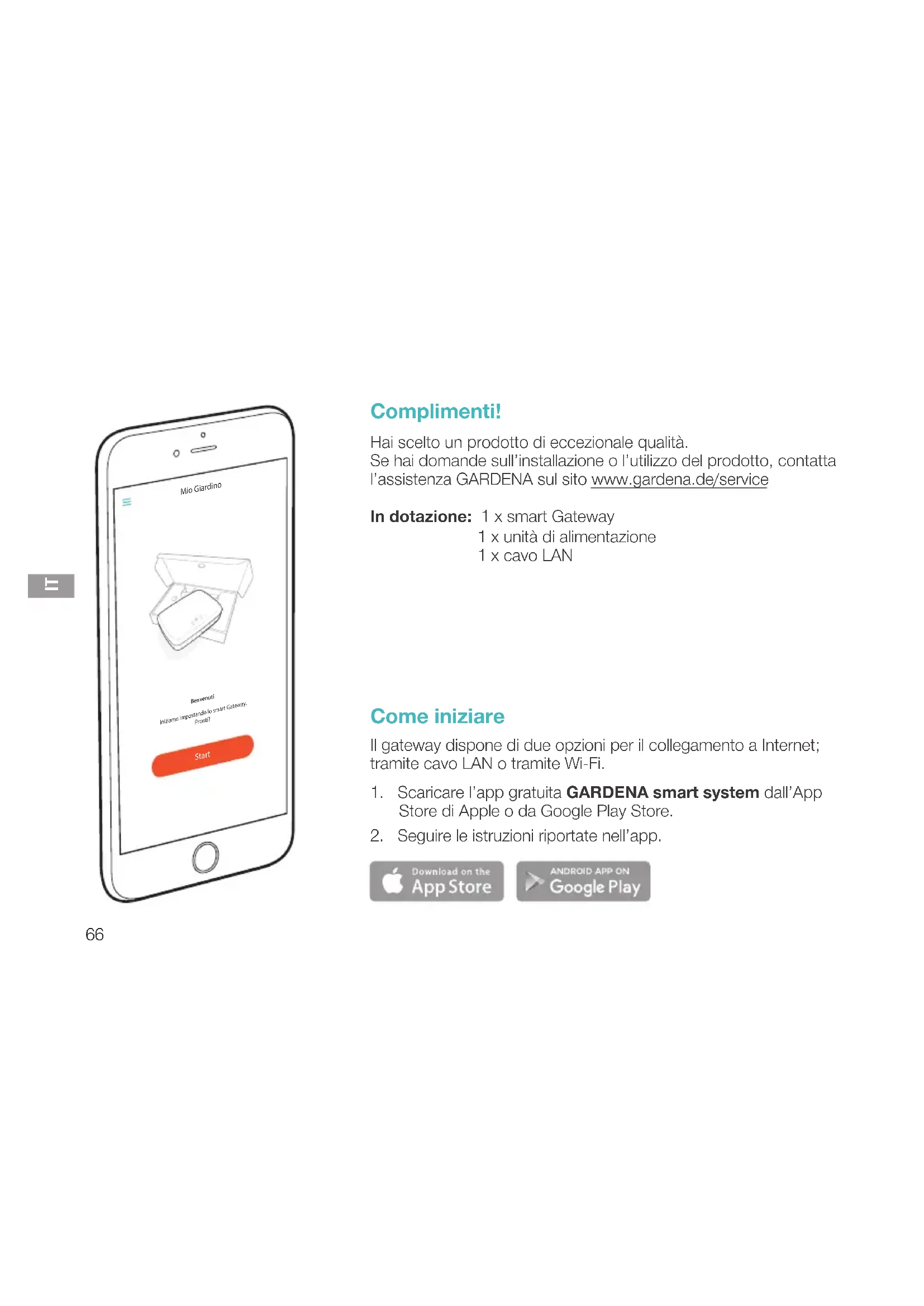 Complimenti! Hai scelto un prodotto di eccezionale qualità. Se hai domande sull’installazione o l’utilizzo del prodotto, contatta l’assistenza GARDENA sul sito www.gardena.de/service In dotazione: 1 x smart Gateway 1 x unità di alimentazione 1 x cavo LAN Come iniziare Il gateway dispone di due opzioni per il collegamento a Internet; tramite cavo LAN o tramite Wi-Fi.