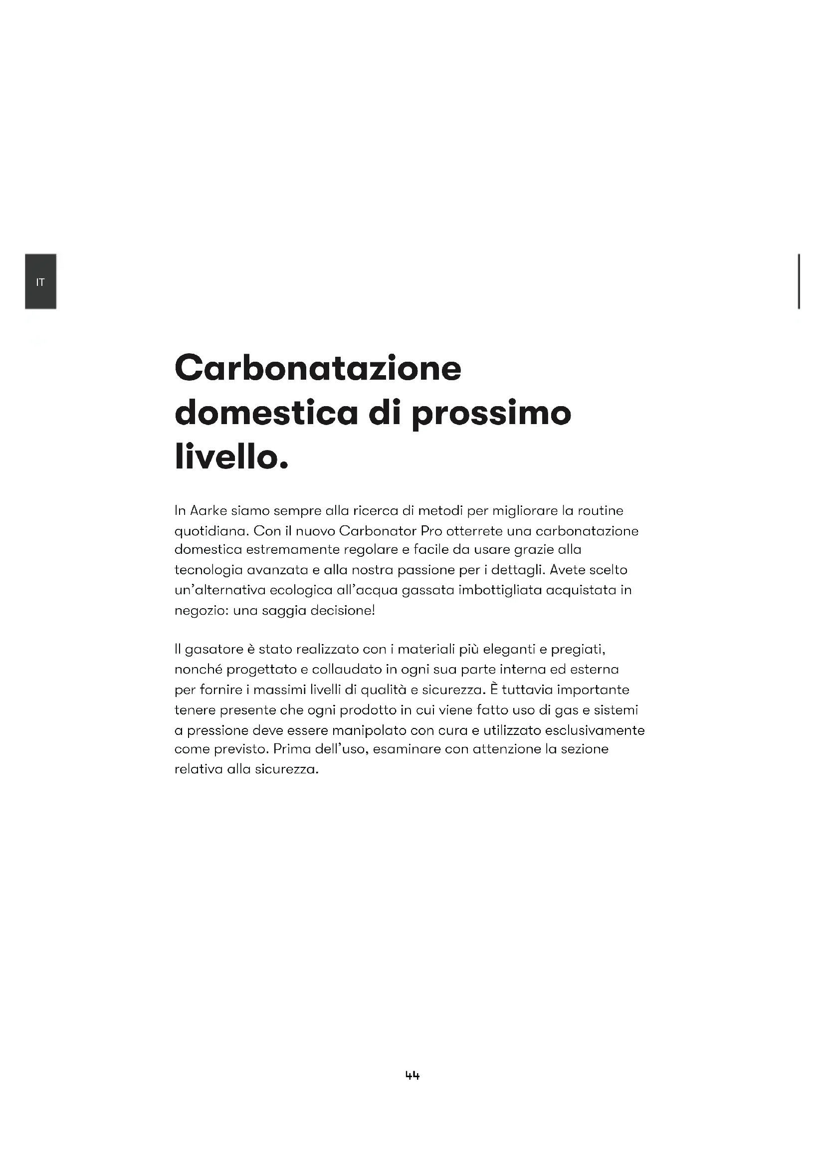 support@aarke.com En caso de que la guía de resolución de problemas no sirva de ayuda, póngase en contacto con nosotros en support@aarke.com. Tendrá nuestra respuesta en un plazo de dos días laborables. Nuestro departamento de servicio al cliente se encuentra en Suecia y puede comunicar en inglés y en los idiomas nórdicos. Para la asistencia en otros idiomas, su solicitud se remitirá a un distribuidor local. Escanee el código QR para obtener información adicional y las preguntas más frecuentes ES44 Carbonatazione domestica di prossimo livello. In Aarke siamo sempre alla ricerca di metodi per migliorare la routine quotidiana. Con il nuovo Carbonator Pro otterrete una carbonatazione domestica estremamente regolare e facile da usare grazie alla tecnologia avanzata e alla nostra passione per i dettagli. Avete scelto un’alternativa ecologica all’acqua gassata imbottigliata acquistata in negozio: una saggia decisione! Il gasatore è stato realizzato con i materiali più eleganti e pregiati, nonché progettato e collaudato in ogni sua parte interna ed esterna per fornire i massimi livelli di qualità e sicurezza. È tuttavia importante tenere presente che ogni prodotto in cui viene fatto uso di gas e sistemi a pressione deve essere manipolato con cura e utilizzato esclusivamente come previsto. Prima dell’uso, esaminare con attenzione la sezione relativa alla sicurezza. IT45 Elementi e componenti Carbonator Pro Cartellina di benvenuto con panno di pulizia Bottiglia di vetro Elementi inclusi Specifiche tecniche Carbonator Pro Altezza 510 mm Larghezza 170 mm Profondità 290 mm Peso 3740 g Bottiglia di vetro Altezza 230 mm Diametro 90 mm Peso 690 g Volume 800 ml (700 fino alla linea di riempimento) La bottiglia è lavabile in lavastoviglie Manopola di rilascio Copertura Vano per la bombola del gas Base Vassoio raccogligocce Pulsante di carbonatazione Area per premere il coperchio Linea di riempimento IT46 Sicurezza globale Mantenere il gasatore a una temperatura di 1-40°C Non gasare usando una bottiglia danneggiata Usare solo la bottiglia per acqua di vetro Carbonator Pro per la carbonatazione Gasare solo acqua, non altre bevande