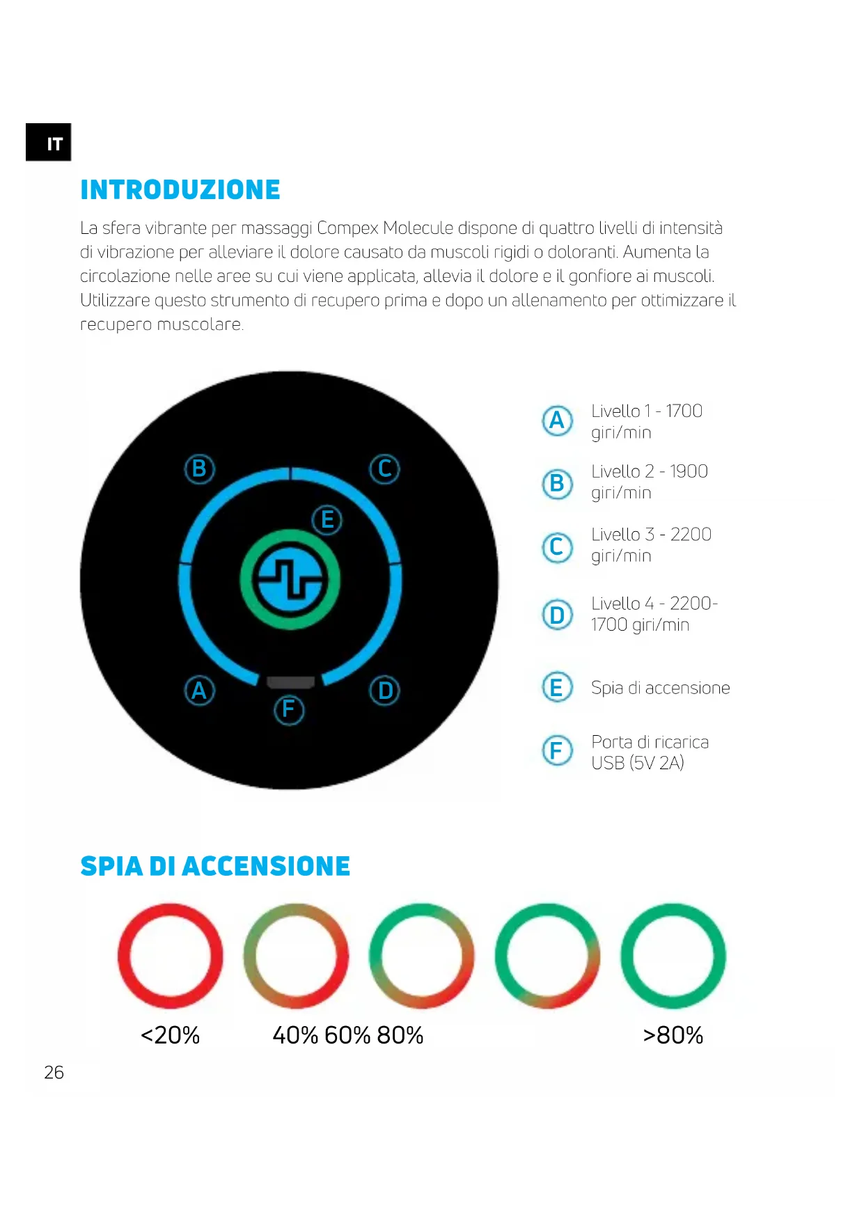 INTRODUZIONE La sfera vibrante per massaggi Compex Molecule dispone di quattro livelli di intensità di vibrazione per alleviare il dolore causato da muscoli rigidi o doloranti. Aumenta la circolazione nelle aree su cui viene applicata, allevia il dolore e il gonfiore ai muscoli. Utilizzare questo strumento di recupero prima e dopo un allenamento per ottimizzare il recupero muscolare.IT