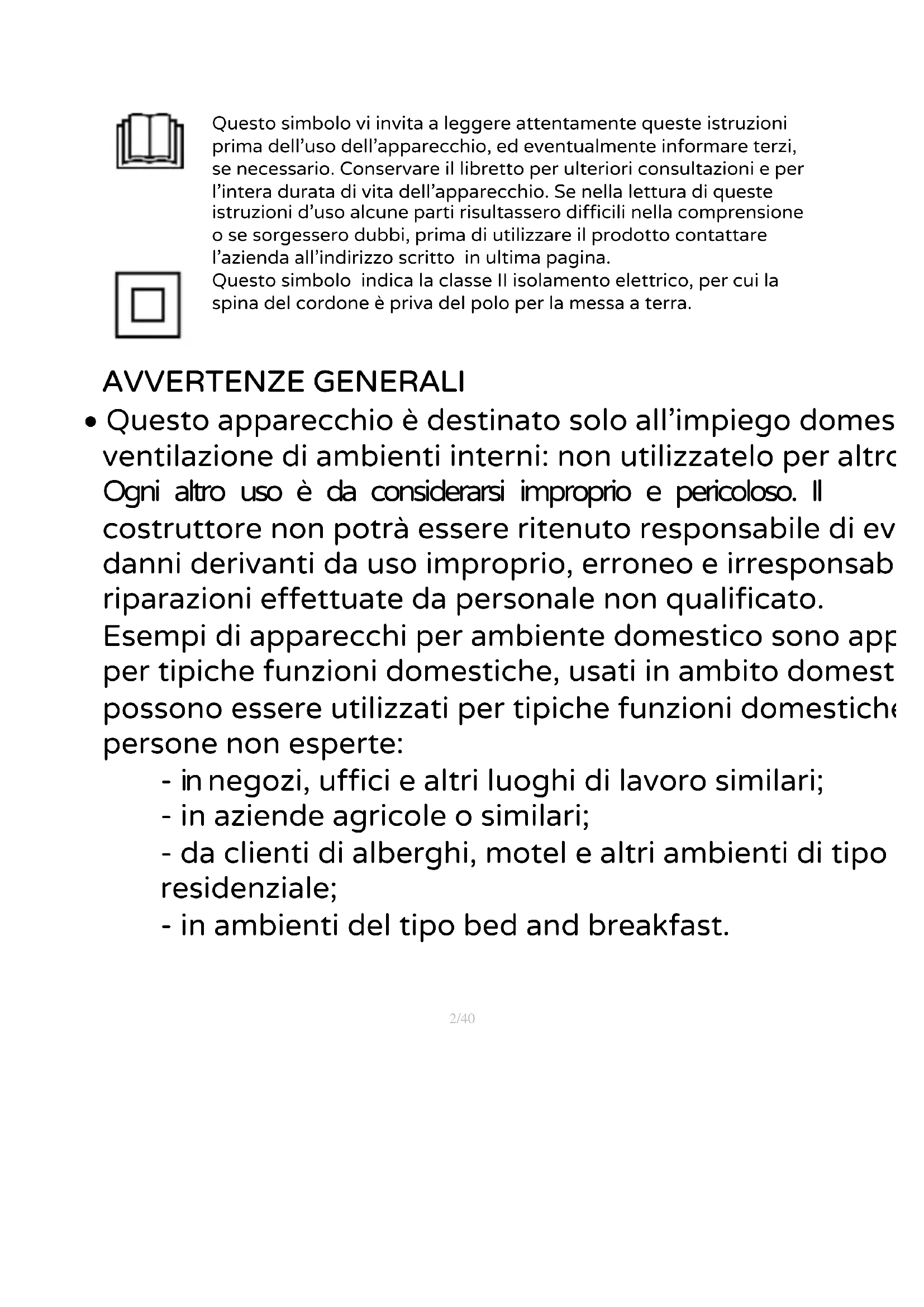 AVVERTENZE GENERALI Questo apparecchio è destinato solo all’impiego domestico, per la ventilazione di ambienti interni: non utilizzatelo per altro scopo. Ogni altro uso è da considerarsi improprio e pericoloso. Il costruttore non potrà essere ritenuto responsabile di eventuali danni derivanti da uso improprio, erroneo e irresponsabile e/o da riparazioni effettuate da personale non qualificato. Esempi di apparecchi per ambiente domestico sono apparecchi per tipiche funzioni domestiche, usati in ambito domestico, che possono essere utilizzati per tipiche funzioni domestiche anche da persone non esperte: - in negozi, uffici e altri luoghi di lavoro similari; - in aziende agricole o similari; - da clienti di alberghi, motel e altri ambienti di tipo residenziale; - in ambienti del tipo bed and breakfast.3/40