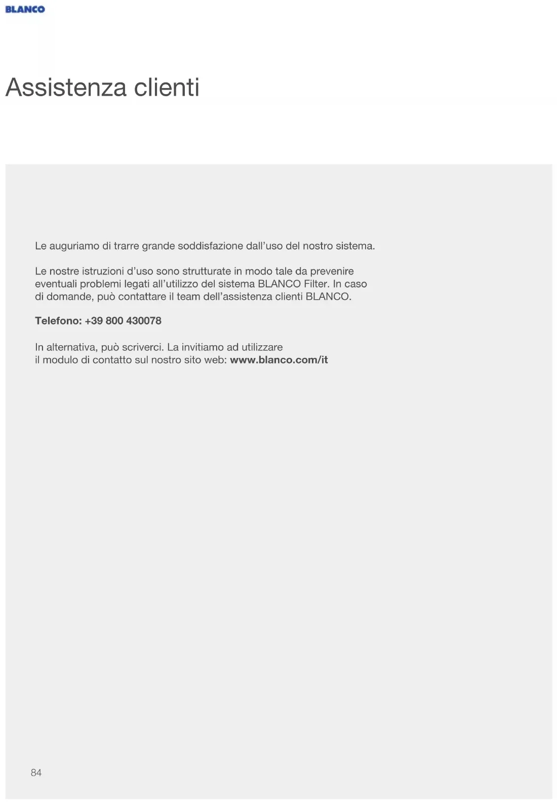 Vervangingsonderdelen 80Afvoer/Milieu Correcte afvoer van oude apparaten (elektronisch afval) (In EU-landen en andere Europese landen met een gescheiden inzameling). Op de etikettering op het product, de toebehoren en de meegeleverde documentatie staat aangeduid dat het product en de toebehoren aan het einde van hun levensduur niet mogen worden weggegooid bij het gewone huishoudelijke afval. Gooi dit apparaat en de toebehoren gescheiden van ander afval weg om mogelijke schade aan het milieu of gezondheid door ongecontroleerde afvalverwijdering te voorkomen. Door oude toestellen en hun toebehoren op de correcte manier af te voeren, draagt u bij tot de duurzame recycling van producten. Particuliere gebruikers moeten contact opnemen met de winkel waar ze het product hebben gekocht of met de bevoegde autoriteiten om te vernemen waar ze het oude apparaat en de toebehoren kunnen inleveren voor een milieuvriendelijke afvoer. Zakelijkegebruikers moeten contact opnemen met hun leverancier en handelen volgens de voorwaarden in hun koopovereenkomst. Dit product en de elektronische toebehoren mogen niet bij ander bedrijfsafval worden weggegooid. Naleving Het systeem voldoet aan de vereisten van de relevante richtlijnen. Een verklaring van conformiteit kan worden aangevraagd bijBLANCO. 8182Indice Assistenza clienti 84 Introduzione 85 Istruzioni sulla sicurezza 86 BLANCO drink.filter EVOL-S Pro 88 Panoramica ______________________________________________________________________ 88 Unità filtrante _____________________________________________________________________ 89 Miscelatore da cucina Filter _________________________________________________________ 90 Unità di controllo Filter _____________________________________________________________ 91 Funzionamento 92 Acqua fredda e calda dell’impianto domestico _________________________________________ 92 Acqua filtrata _____________________________________________________________________ 93 Sostituzione della cartuccia del filtro 94 Sostituzione della testata di fissaggio del filtro 96 Impostazione della capacità del filtro 97 Guasti 98 Pulizia 99 Pezzi di ricambio 100 Smaltimento/ambiente 101 Conformità 101 83Assistenza clienti Le auguriamo di trarre grande soddisfazione dall’uso del nostro sistema. Le nostre istruzioni d’uso sono strutturate in modo tale da prevenire eventuali problemi legati all’utilizzo del sistema BLANCO Filter. In caso di domande, può contattare il team dell’assistenza clienti BLANCO. Telefono: +39 800 430078 In alternativa, può scriverci. La invitiamo ad utilizzare il modulo di contatto sul nostro sito web: www.blanco.com/it 84Introduzione Il sistema BLANCO Filter filtra l’acqua dell’impianto domestico. Si ottiene così acqua potabile e con un sapore migliore. L’acqua dell’impianto domestico e quella filtrata vengono erogate tramite due aeratori separati. Il sistema è stato progettato per l’uso privato domestico, solitamente in cucina. Tuttavia, può essere utilizzato anche in aree pubbliche come uci o studi medici. Tale uso comporterebbe requisiti extra in termini di pulizia e manutenzione, da rispettare a cura dell’utente. Ogni altro uso che esula da quelli previsti o dalle finalità previste è considerato un uso improprio. BLANCO declina ogni responsabilità per i danni derivanti dall’uso improprio. Le presenti istruzioni d’uso illustrano il sistema e ne spiegano le funzioni. Si prega di leggere le istruzioni con attenzione, in particolare per quanto riguarda gli avvertimenti sulla sicurezza, e di conservarle insieme all’apparecchio. I disegni e le descrizioni vengono forniti per agevolare lacomprensione. Alcuni dettagli dell’apparecchio possono variare rispetto alle illustrazioni. Le informazioni e i requisiti per l’installazione sono riportati nel manuale di installazione fornito separatamente. Se si desidera installare l’apparecchio in una posizione diversa o non si dispone più di una copia delle istruzioni per l’installazione, contattare l’assistenza clienti BLANCO. 85Istruzioni sulla sicurezza Questo apparecchio può essere utilizzato da bambini di almeno 8 anni e da persone con disabilità fisiche, sensoriali o mentali. Non sono necessarie un’esperienza pregressa o conoscenze particolari, purché venga mostrato all’utente, sotto sorveglianza, come utilizzare l’apparecchio in sicurezza o gli vengano fornite le relative informazioni e, inoltre, l’utente comprenda i rischi collegati all’uso. I bambini non devono giocare con l’apparecchio. La pulizia ela manutenzione non devono essere eettuate da bambini senza supervisione. L’apparecchio è stato progettato per essere utilizzato in un lavello in uno spazio chiuso (solitamente in cucina). Deve solo essere collegato all’ingresso dell’acqua potabile, conformemente ai requisiti locali, con una pressione di flusso costante di1-10 bar e una temperatura dell’acqua compresa tra 5 e 30 °C. La temperatura ambiente deve essere compresa tra 10 e 30 °C. Evitare l’esposizione diretta alla luce solare. Eventuali modifiche all’apparecchio o all’interno dello stesso possono essere eettuate unicamente da BLANCO o da tecnici specializzati formati da BLANCO. L’apparecchio può essere aperto esclusivamente da tecnici formati equalificati! Il cavo di alimentazione deve essere sistemato in modo tale da evitare eventuali danni allo stesso. In caso di danni riscontrati sul cavo o sulla spina, farli sostituire da un tecnico specializzato. L’apparecchio può essere collegato soltanto a una rete elettrica protetta da un interruttore dierenziale, con un fusibile da almeno 16 A eun’alimentazione elettrica costante di 230 V/50 Hz. 86Istruzioni sulla sicurezza Assicurarsi che il sistema sia installato in una posizione antigelo. Icomponenti possono danneggiarsi col gelo. Se necessario, contattare il team dell’assistenza clienti BLANCO. Quando si usa un filtro con uno scambiatore ionico per ridurre il calcare, l’acqua nel filt
