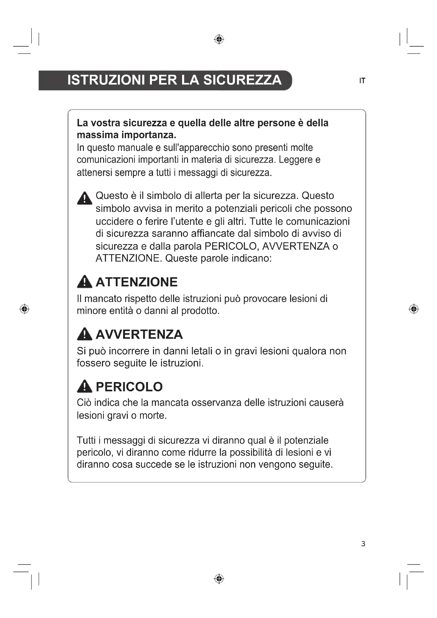 La vostra sicurezza e quella delle altre persone è della massima importanza. In questo manuale e sull'apparecchio sono presenti molte comunicazioni importanti in materia di sicurezza. Leggere e attenersi sempre a tutti i messaggi di sicurezza. Questo è il simbolo di allerta per la sicurezza. Questo simbolo avvisa in merito a potenziali pericoli che possono uccidere o ferire l’utente e gli altri. Tutte le comunicazioni di sicurezza saranno affiancate dal simbolo di avviso di sicurezza e dalla parola PERICOLO, AVVERTENZA o ATTENZIONE. Queste parole indicano: ATTENZIONE Il mancato rispetto delle istruzioni può provocare lesioni di minore entità o danni al prodotto. AVVERTENZA Si può incorrere in danni letali o in gravi lesioni qualora non fossero seguite le istruzioni. PERICOLO Ciò indica che la mancata osservanza delle istruzioni causerà lesioni gravi o morte. Tutti i messaggi di sicurezza vi diranno qual è il potenziale pericolo, vi diranno come ridurre la possibilità di lesioni e vi diranno cosa succede se le istruzioni non vengono seguite.