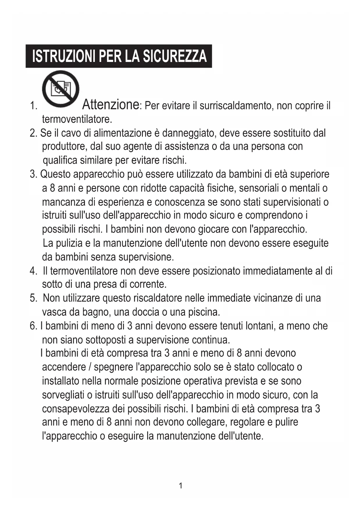 Alimentatore: AC 220-240V ~ 50Hz BASSOProtezione di sicurezza1. Protezione surriscaldamento: quando la temperatura nel termoventilatore è troppoalta a causa di un’anomalia nell'ambiente di utilizzo o uso improprio, il termostatointerno del dispositivo può automaticamente interrompere l'alimentazione e iltermoventilatore smetterà di funzionare. Dopo essersi raffreddato, il termoventilatorepuò tornare al normale utilizzo dopo aver rimosso l’anomalia.2. Protezione inversione: quando l'intero termoventilatore è invertito, il sistemadi sicurezza disattiverà automaticamente l’alimentazione e il dispositivotornerà allo stato originale prima dell'inversione il corpo è posto in posizione verticale. Se il prodotto non funziona o non funziona correttamente, controllare innanzitutto il seguente elenco. Se il motivo per cui il prodotto non funziona o non funziona correttamente non è incluso nell'elenco, il prodotto potrebbe essere soggetto a difetti di fabbrica o malfunzionamenti. In questo, si consiglia di inviare il prodotto al rivenditore per la riparazione e per ricevere assistenza.