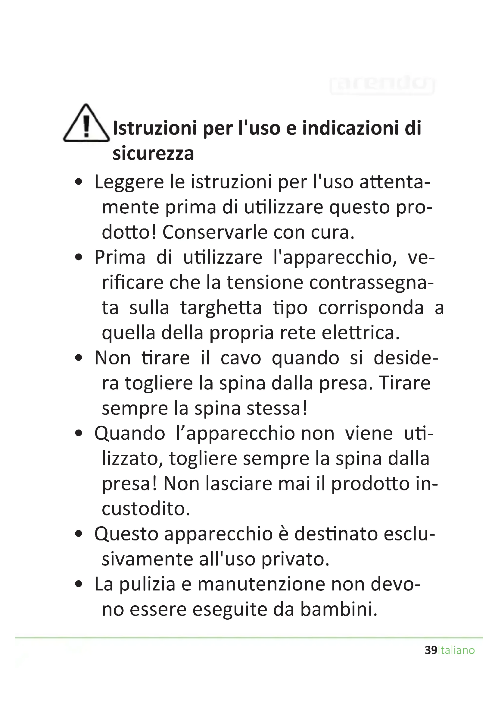 - Non introdurre nell'apparecchio par del corpo.44 Italiano Grazie per aver scelto un prodoo di Arendo. Per ulizzare con soddisfazione e a lungo l'apparecchio acquistato, si prega di leggere aentamente le seguen istruzioni per l’uso.