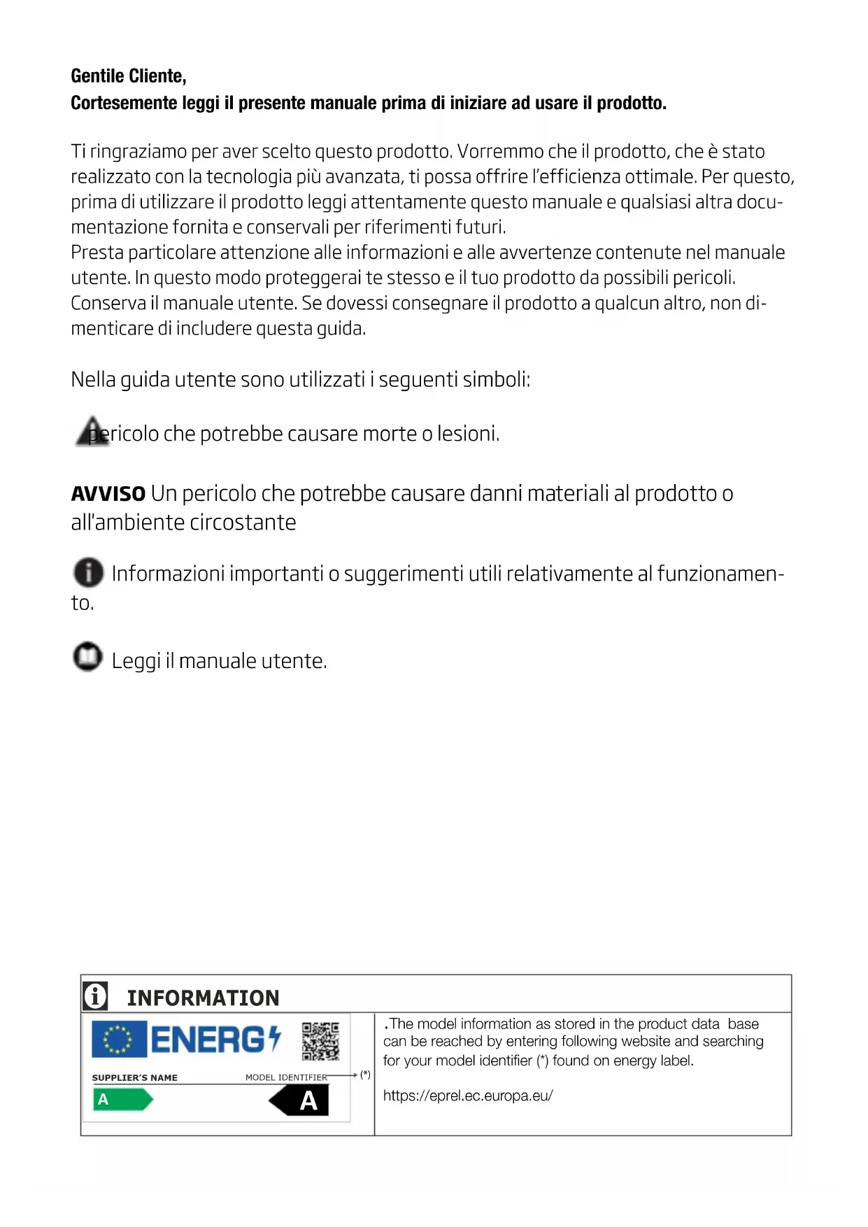 AVVERTENZA: Qualora il problema persista dopo aver seguito le istruzioni contenute in questa selezione, contattare il proprio fornitore oppure un Servizio Autorizzato. Evitare in ogni caso di riparare il prodotto.DISCLAIMER / AVVERTENZE Alcuni guasti (semplici) possono essere adeguatamente gestiti dall'utente finale senza che sorgano problemi di sicurezza o utilizzi non sicuri, a condizione che vengano eseguiti entro i limiti e in conformità con le seguenti istruzioni (vedere la sezione "Riparazione fai da te"). Pertanto, salvo diversa autorizzazione nella sezione di seguito "Riparazione fai da te", le riparazioni devono essere indirizzate a manutentori professionisti registrati al fine di evitare problemi di sicurezza. Un manutentore professionista registrato è un manutentore professionista a cui è stato concesso l'accesso alle istruzioni e all'elenco dei pezzi di ricambio di questo prodotto dal produttore secondo le modalità descritte negli atti legislativi ai sensi della Direttiva 2009/125/CE. Tuttavia, solo l'agente dell'assistenza (ovvero i manutentori professionisti autorizzati) che è possibile contattare tramite il numero di telefono indicato nel manuale dell'utente / scheda di garanzia o tramite il rivenditore autorizzato che può fornire assistenza in base ai termini di garanzia. Pertanto, si prega di notare che le riparazioni da parte di manutentori professionisti (non autorizzati da Beko) invaliderà la garanzia. Riparazione fai da te La riparazione fai da te può essere eseguita dall'utente finale per quanto riguarda i seguenti pezzi di ricambio: maniglie delle porte, cerniere delle porte, vassoi, cestelli e guarnizioni delle porte (un elenco aggiornato è disponibile anche su support.beko.com dal 1° marzo 2021) Inoltre, per garantire la sicurezza del prodotto e per prevenire il rischio di lesioni gravi, la suddetta riparazione fai da te deve essere eseguita seguendo le istruzioni nel manuale utente per la riparazione fai da te o disponibili in support.beko.com Per la propria sicurezza, scollegare il prodotto prima di tentare qualsiasi riparazione fai da te.Tentativi di riparazione e riparazione da parte degli utenti finali per parti non incluse in tale elenco e/o che non seguono le istruzioni nei manuali utente per la riparazione fai da te o che sono disponibili in support.beko.com, potrebbe dar luogo a problemi di sicurezza non imputabili a Bekoe invaliderà la garanzia del prodotto. Pertanto, si raccomanda vivamente agli utenti finali di astenersi dal tentativo di eseguire riparazioni che non rientrano nell'elenco dei pezzi di ricambio menzionato, contattando in tali casi manutentori professionisti autorizzati o manutentori professionisti registrati. Altrimenti, tali tentativi da parte degli utenti finali possono causare problemi di sicurezza e danneggiare il prodotto e conseguentemente causare incendi, inondazioni, elettrocuzione e gravi lesioni personali. A titolo esemplificativo, ma non esaustivo, le seguenti riparazioni devono essere indirizzate ai manutentori professionisti autorizzati o manutentori professionisti registrati: compressore, circuito frigorifero, scheda principale, scheda inverter, scheda display ecc. Il produttore/venditore non può essere ritenuto responsabile in ogni caso in cui gli utenti finali non rispettano quanto sopra. La disponibilità dei pezzi di ricambio frigorifero che hai acquistato è di 10 anni. Durante questo periodo saranno disponibili ricambi originali per il corretto funzionamento frigorifero. La durata minima della garanzia del frigorifero acquistato è di 24 mesi. Questo prodotto è dotato di una sorgente di illuminazione con classe energetica "G". La sorgente di illuminazione nel prodotto dovrà essere sostituita solo da professionisti nel campo della riparazione. Informazioni sulla classificazione dell’imballaggi Scansiona il Qrcode che si trova sull’imballo del prodotto per trovare tutte le informazioni relative all’imballo e come gestirne il suo corretto smaltimento.Cher client, Veuillez lire ce manuel avant d'utiliser l'appareil. Nous vous remercions d'avoir choisi ce produit. Nous aimerions que vous obteniez une efficacité optimale de ce produit de haute qualité qui a été fabriqué avec une technolo-gie de pointe. À cette fin, lisez attentivement ce manuel et toute autre documentation fournie avant d'utiliser le produit et conservez-les comme référence. Tenez compte de toutes les informations et de tous les avertissements figurant dans le manuel d'utilisation. De cette façon, vous vous protégerez, vous et votre produit, contre les dangers qui peuvent survenir.Conservez le manuel d'utilisation. Joignez ce guide à l'unité si vous le remettez à quelqu'un d'autre. Les symboles suivants sont utilisés dans le manuel d'utilisation: Il s'agit d'un danger qui peut entraîner la mort ou des blessures. AVERTISSEMENT Un danger qui peut causer des dommages matériels au produit ou à son environnement Informations importantes ou conseils utiles sur le fonctionnement. Lisez le manuel d'utilisation. .Vous pouvez accéder aux informations relatives au modèle telles que sauvegardées dans la base de données des pro-duits en entrant le site internet suivant et en recherchant l'identifiant de votre modèle (*) qui se trouve sur la vignette énergiehttps://eprel.ec.europa.eu/