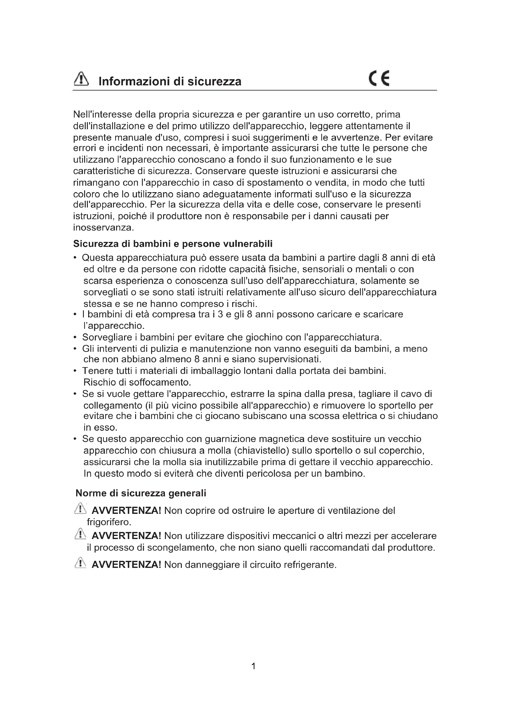 - Se questo apparecchio con guarnizione magnetica deve sostituire un vecchio apparecchio con chiusura a molla (chiavistello) sullo sportello o sul coperchio, assicurarsi che la molla sia inutilizzabile prima di gettare il vecchio apparecchio. In questo modo si eviterà che diventi pericolosa per un bambino. Norme di sicurezza generali AVVERTENZA! Non coprire od ostruire le aperture di ventilazione del frigorifero. AVVERTENZA! Non utilizzare dispositivi meccanici o altri mezzi per accelerare il processo di scongelamento, che non siano quelli raccomandati dal produttore. AVVERTENZA! Non danneggiare il circuito refrigerante. 1Informazioni di sicurezza AVVERTENZA! Non utilizzare altri apparecchi elettrici (come le macchine per gelato) all'interno di apparecchi di refrigerazione, a meno che non siano approvati a tal fine dal produttore. AVVERTENZA! Non toccare la lampadina se è rimasta accesa per un lungo periodo di tempo, perché potrebbe essere molto calda.