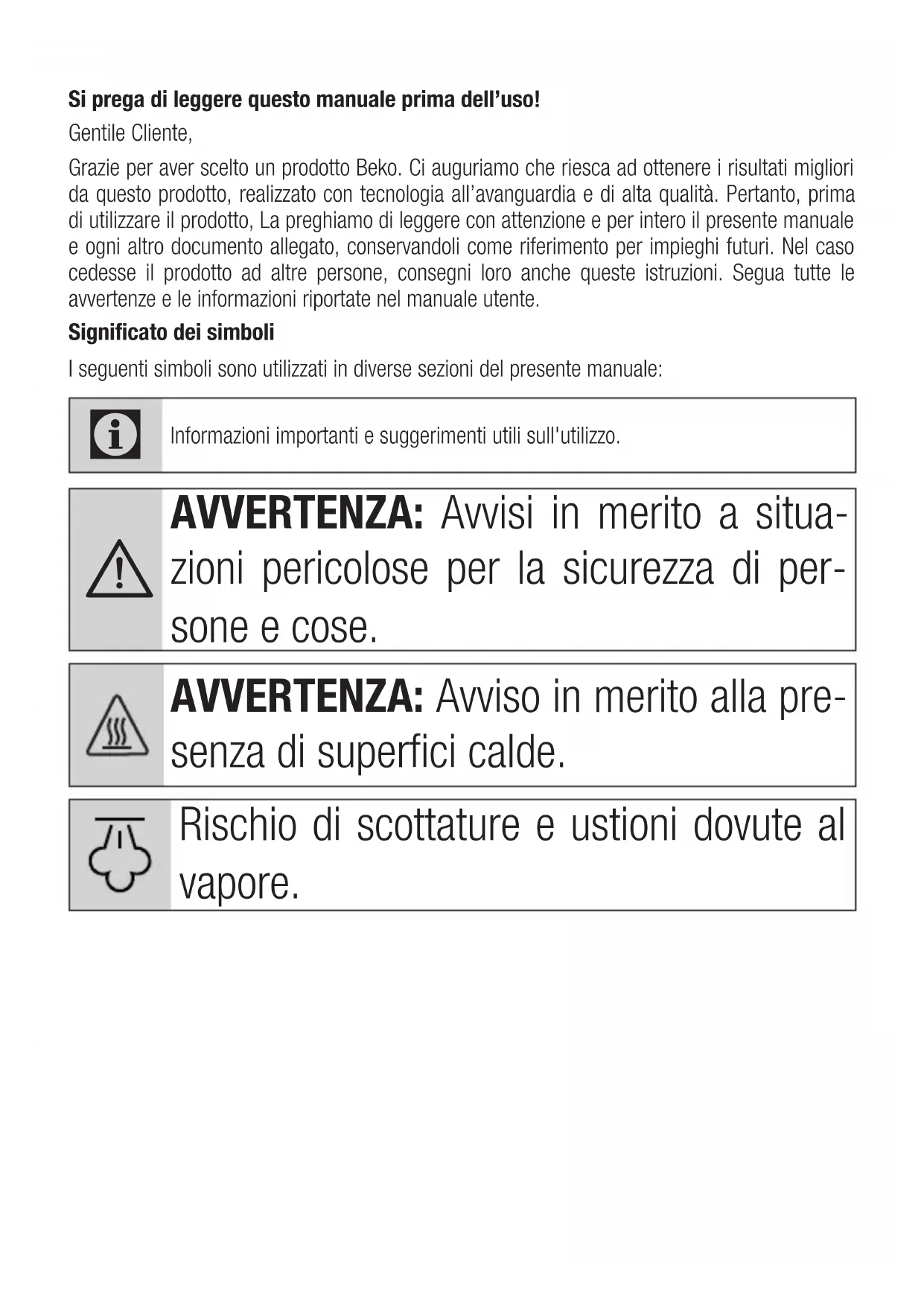 - Utilizați cu atenție şi direcționați aburul în jurul accesoriilor din metal. 4 DepanareaSi prega di leggere questo manuale prima dell’uso! Gentile Cliente, Grazie per aver scelto un prodotto Beko. Ci auguriamo che riesca ad ottenere i risultati migliori da questo prodotto, realizzato con tecnologia all’avanguardia e di alta qualità. Pertanto, prima di utilizzare il prodotto, La preghiamo di leggere con attenzione e per intero il presente manuale e ogni altro documento allegato, conservandoli come riferimento per impieghi futuri. Nel caso cedesse il prodotto ad altre persone, consegni loro anche queste istruzioni. Segua tutte le avvertenze e le informazioni riportate nel manuale utente. Significato dei simboli I seguenti simboli sono utilizzati in diverse sezioni del presente manuale: