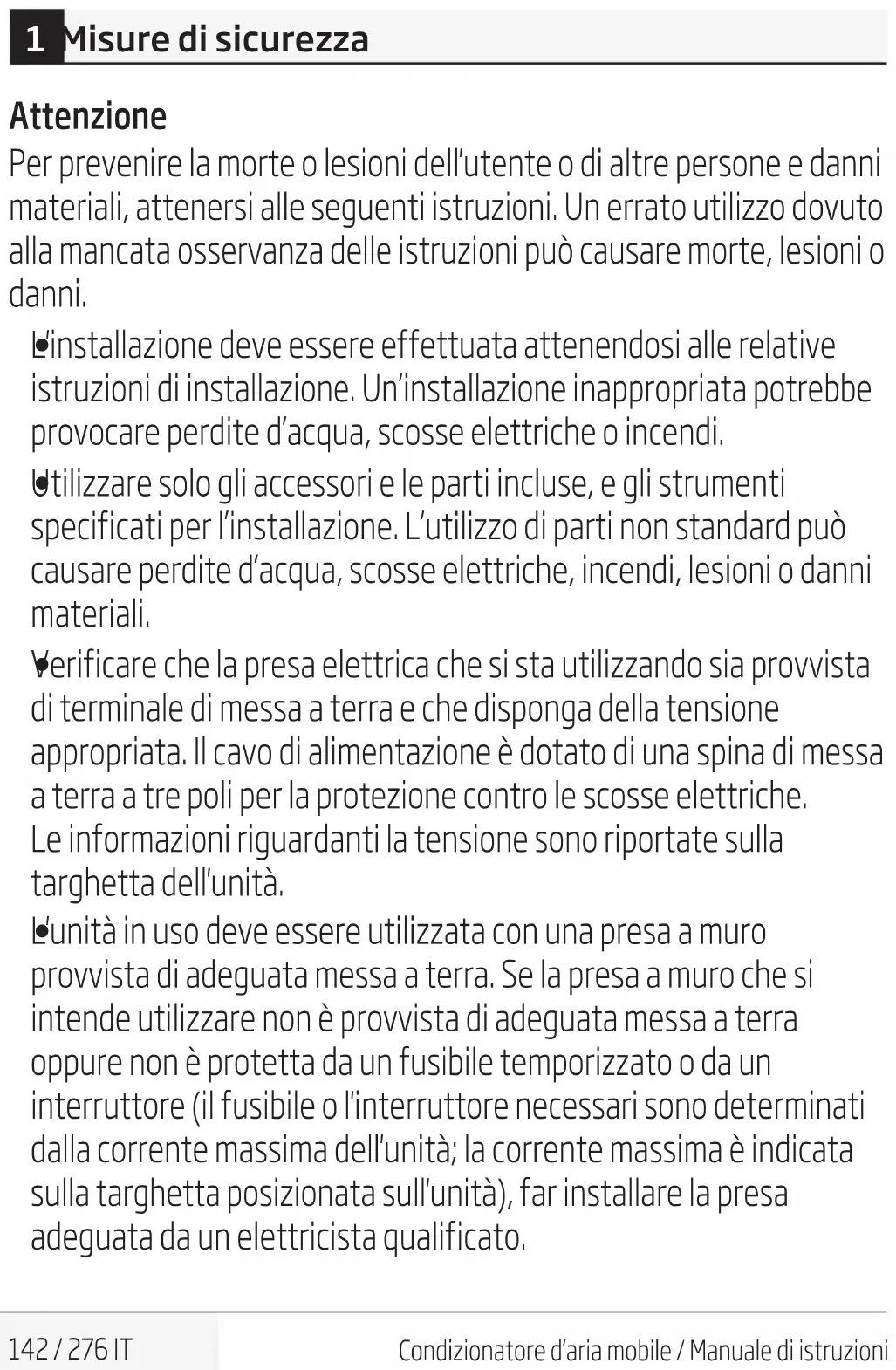 Tenere la spina per il capo della spina di alimentazione quando la si estrae. 1 Misure di sicurezzaCondizionatore d’aria mobile / Manuale di istruzioni 147 / 276 IT