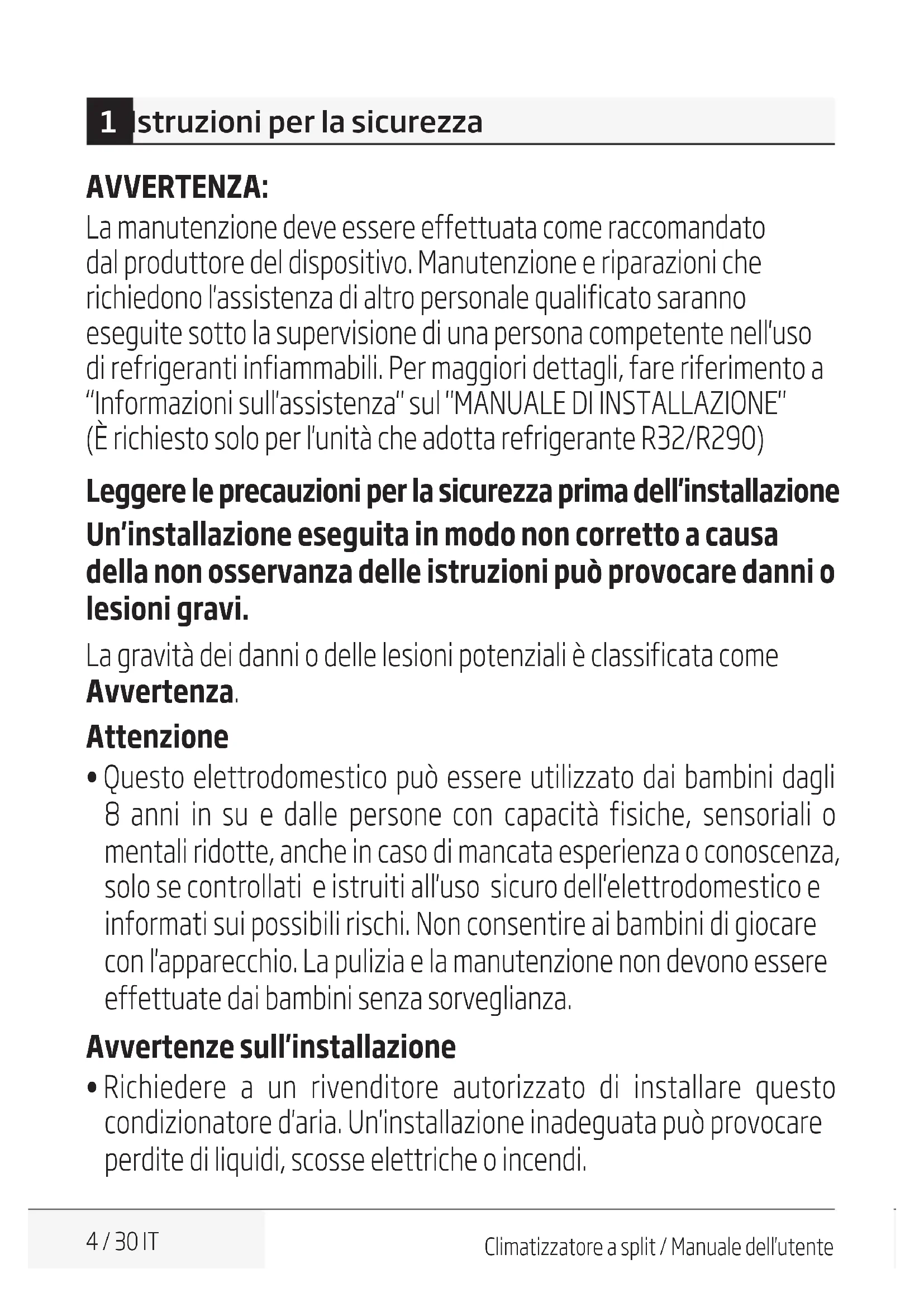 Climatizzatore a split / Manuale dell'utente 3 / 30 IT1 Istruzioni per la sicurezza AVVERTENZA: La manutenzione deve essere effettuata come raccomandato dal produttore del dispositivo. Manutenzione e riparazioni che richiedono l'assistenza di altro personale qualificato saranno eseguite sotto la supervisione di una persona competente nell'uso di refrigeranti infiammabili. Per maggiori dettagli, fare riferimento a “Informazioni sull'assistenza" sul "MANUALE DI INSTALLAZIONE" (È richiesto solo per l'unità che adotta refrigerante R32/R290) Leggere le precauzioni per la sicurezza prima dell'installazione Un'installazione eseguita in modo non corretto a causa della non osservanza delle istruzioni può provocare danni o lesioni gravi. La gravità dei danni o delle lesioni potenziali è classificata come Avvertenza. Attenzione t Questo elettrodomestico può essere utilizzato dai bambini dagli 8 anni in su e dalle persone con capacità fisiche, sensoriali o mentali ridotte, anche in caso di mancata esperienza o conoscenza, solo se controllati e istruiti all'uso sicuro dell'elettrodomestico e informati sui possibili rischi. Non consentire ai bambini di giocare con l'apparecchio. La pulizia e la manutenzione non devono essere effettuate dai bambini senza sorveglianza. Avvertenze sull'installazione t Richiedere a un rivenditore autorizzato di installare questo condizionatore d'aria. Un'installazione inadeguata può provocare perdite di liquidi, scosse elettriche o incendi. Climatizzatore a split / Manuale dell'utente 4 / 30 ITt La riparazione, la manutenzione e lo spostamento dell'unità devono essere eseguiti da personale tecnico autorizzato. Riparazioni non adeguate possono provocare lesioni gravi o guasti al prodotto. Avvertenze sull'uso del prodotto t Se si verifica una situazione anomala (quale un odore di bruciato), spegnere immediatamente l'unità e scollegare l'alimentazione. Rivolgersi al proprio rivenditore per istruzioni in modo da scongiurare scosse elettriche, incendi o infortuni. t Non inserire dita, oggetti oblunghi o altri oggetti nelle prese o nelle uscite d'aria. Dato che le ventole potrebbero ruotare ad alta velocità, potrebbero verificarsi infortuni, t Non utilizzare spray infiammabili, come spray e lacca per capelli o vernici, in prossimità dell'unità. Così facendo, potrebbero verificarsi incendi o esplosioni. t Non utilizzare il condizionatore d'aria nei pressi di gas combustibili. I gas emessi potrebbero raccogliersi attorno all'unità e provocare esplosioni. t Non utilizzare il condizionatore d'aria in un'ambiente umido (ad es. bagni o lavanderie). In questo modo potrebbero verificarsi scosse elettriche e il prodotto potrebbe deteriorarsi. t Non esporre direttamente il proprio corpo al flusso d'aria fredda per lunghi periodi di tempo. Avvertenze sulla sicurezza elettrica t Utilizzare solo il cavo di alimentazione specificato. Se il cavo di alimentazione è danneggiato, occorre farlo sostituire dal produttore o da personale tecnico qualificato. 1 Istruzioni per la sicurezza Climatizzatore a split / Manuale dell'utente 5 / 30 ITt Tenere pulita la spina di alimentazione. Rimuovere la polvere o la sporcizia che si accumulano su o intorno alla spina. Spine sporche possono provocare incendi o scosse elettriche. t Non tirare il cavo di alimentazione per scollegare l'unità. Estrarre la spina dalla presa di corrente tenendola saldamente. Tirando direttamente il cavo è possibile danneggiarlo, provocando incendi o scosse elettriche. t Non utilizzare prolunghe, allungare manualmente il cavo di alimentazione o collegare altre apparecchiature alla stessa presa di corrente del condizionatore d'aria. Collegamenti elettrici instabili, scarso isolamento e tensione insufficiente possono provocare incendi. Avvertenze sulla pulizia e la manutenzione t Spegnere il dispositivo ed scollegare la spina prima della pulizia. In caso contrario potrebbero verificarsi scosse elettriche. t Non pulire il condizionatore d'aria con quantità eccessive d'acqua. t Non pulire il condizionatore d'aria con detergenti combustibili. I detergenti combustibili possono provocare incendi o deformazioni. Attenzione t Se il condizionatore d'aria viene utilizzato in concomitanza con fornelli o altri dispositivi che producono calore, aerare bene il locale per evitare carenza d'ossigeno. t Spegnere il condizionatore d'aria e scollegare l'unità dall'alimentazione se non la si utilizza per lunghi periodi di tempo. t Spegnere e scollegare l'unità durante i temporali. 1 Istruzioni per la sicurezza Climatizzatore a split / Manuale dell'utente 6 / 30 IT1 Istruzioni per la sicurezza t Accertarsi che la condensa dell'acqua sia scaricata senza ostacoli dall'unità. t Non utilizzare il condizionatore d'aria con le mani bagnate. In questo modo potrebbero verificarsi scosse elettriche. t Non utilizzare il dispositivo per scopi diversi da quelli a cui è destinato. t Non salire sull'unità esterna o collocarvi oggetti. t Non lasciare acceso il condizionatore d'aria per lunghi periodi di tempo con porte o finestre aperte oppure se il tasso di umidità è molto elevato. Climatizzatore a split / Manuale dell'utente 7 / 30 IT2.1 Componenti dell'unità