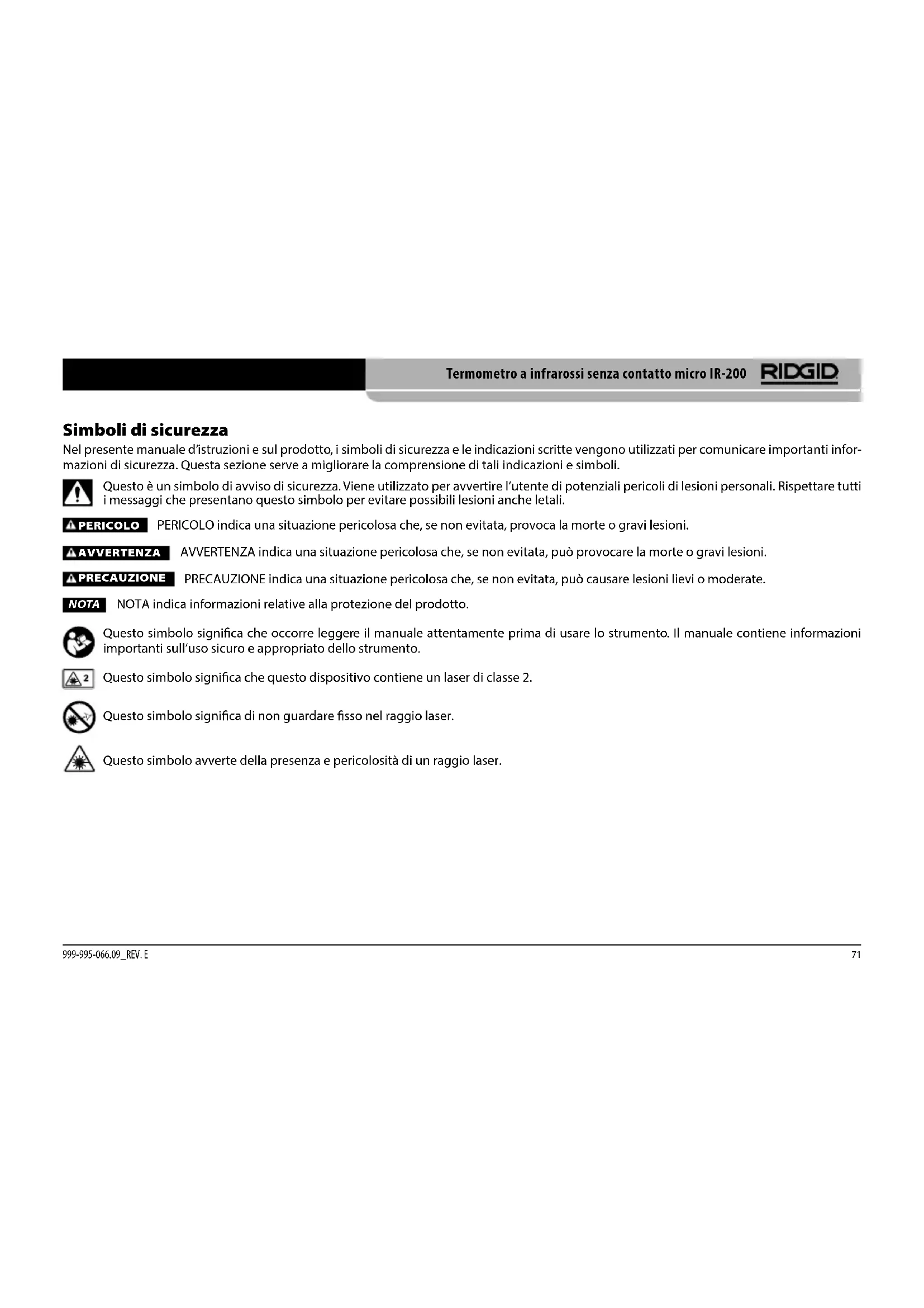 Fare eseguire la revisione dell’apparecchiatura da una persona qualificata che usi solo parti di ricambio originali. Questo garanti- sce la sicurezza dell’attrezzo. Informazioni specifiche di sicurezza AVVERTENZA Questa sezione contiene importanti informazioni di sicurezza speci- fiche per l’attrezzo. Leggere queste precauzioni prima di utilizzare il Termometro a in- frarossi senza contatto micro IR-200 RIDGID® per ridurre il rischio di lesioni agli occhi o altre gravi lesioni personali. CONSERVARE IL PRESENTE MANUALE DI ISTRUZIONI! Conservare il presente manuale con l’apparecchiatura per consentirne la consultazione all’operatore. Sicurezza del termometro a infrarossi