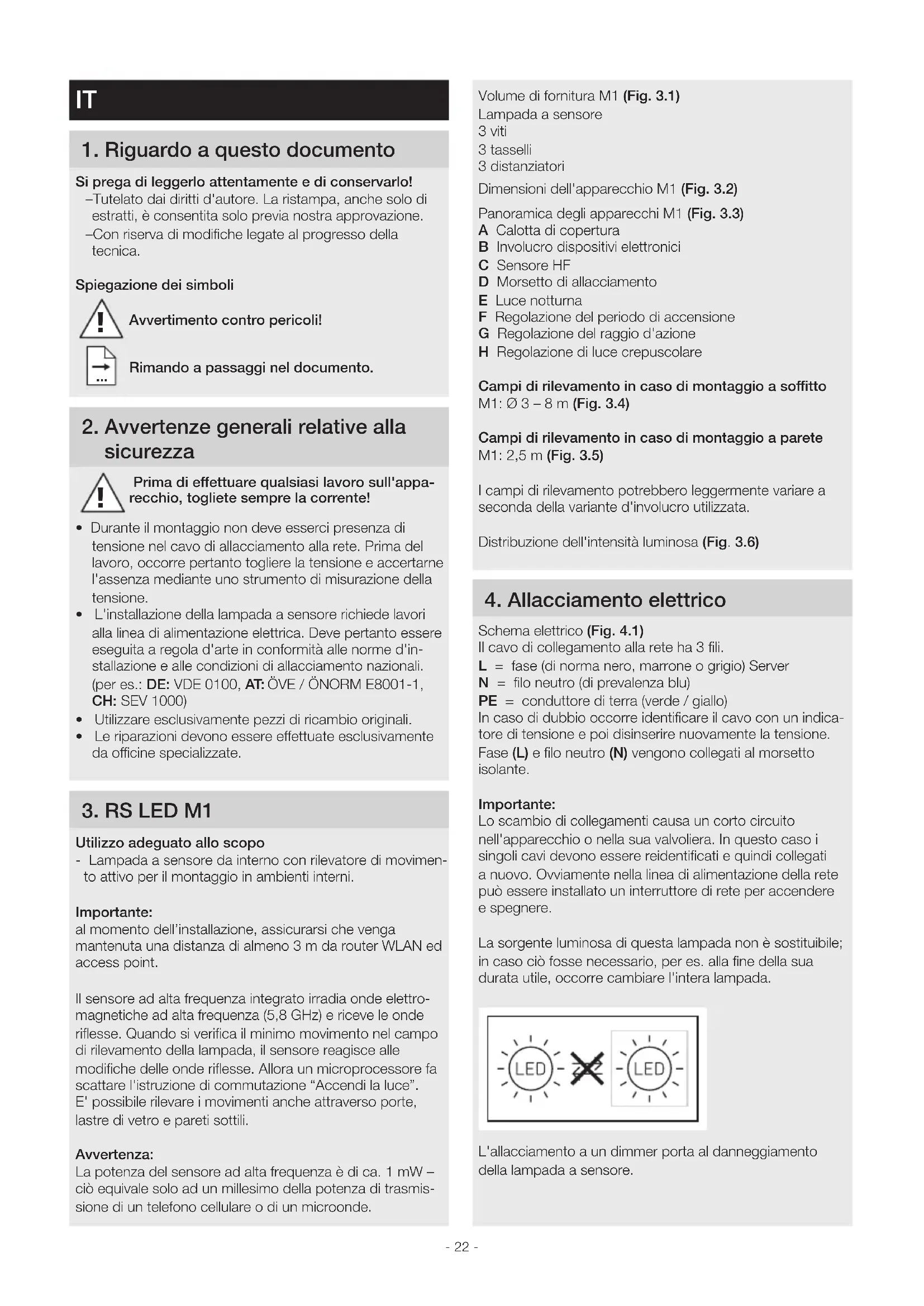 Utilizzo adeguato allo scopo - Lampada a sensore da interno con rilevatore di movimen- to attivo per il montaggio in ambienti interni. Importante: al momento dell’installazione, assicurarsi che venga mantenuta una distanza di almeno 3 m da router WLAN ed access point. Il sensore ad alta frequenza integrato irradia onde elettro- magnetiche ad alta frequenza (5,8 GHz) e riceve le onde riflesse. Quando si verifica il minimo movimento nel campo di rilevamento della lampada, il sensore reagisce alle modifiche delle onde riflesse. Allora un microprocessore fa scattare l'istruzione di commutazione “Accendi la luce”. E' possibile rilevare i movimenti anche attraverso porte, lastre di vetro e pareti sottili. Avvertenza: La potenza del sensore ad alta frequenza è di ca. 1 mW – ciò equivale solo ad un millesimo della potenza di trasmis- sione di un telefono cellulare o di un microonde. !- 23 -